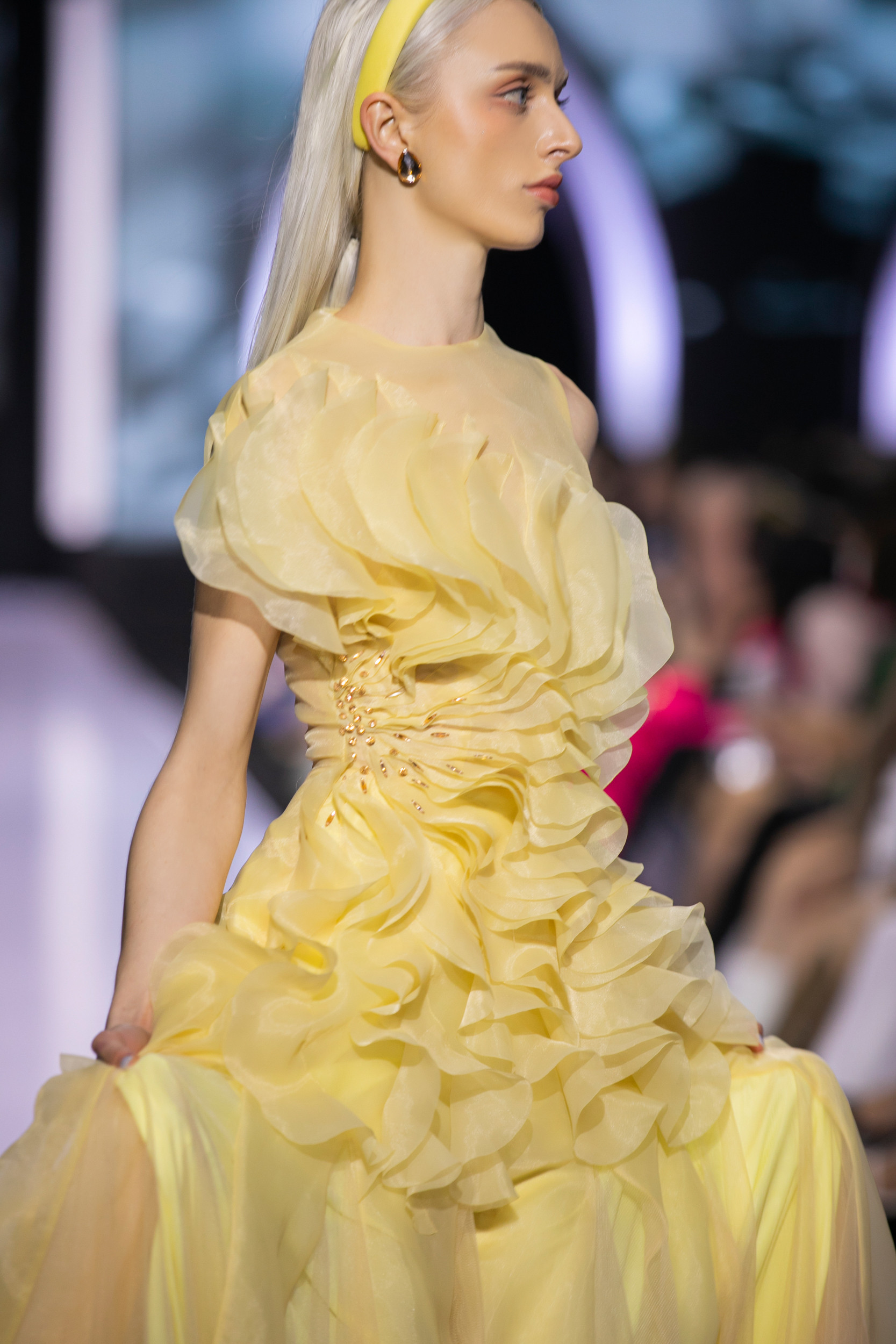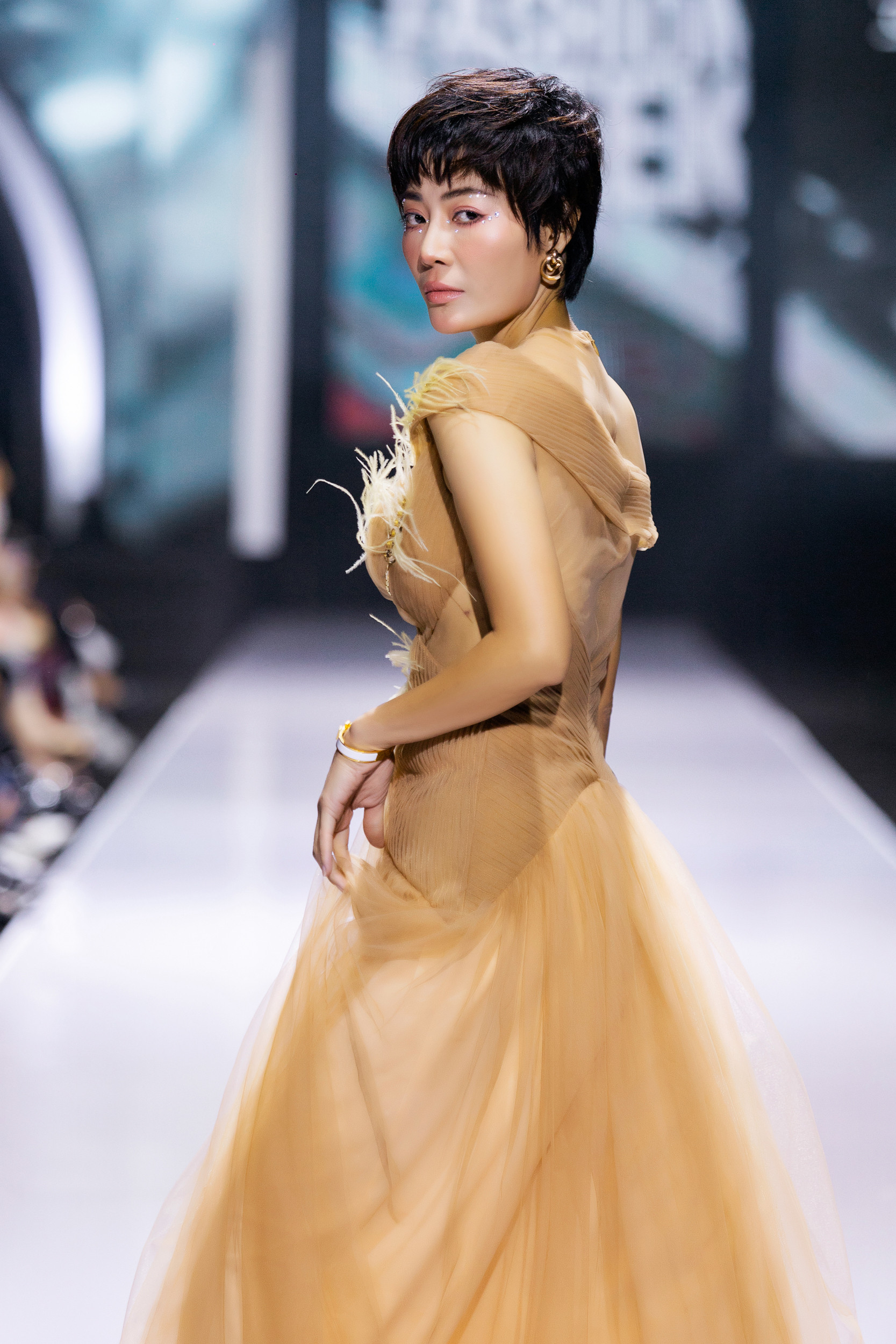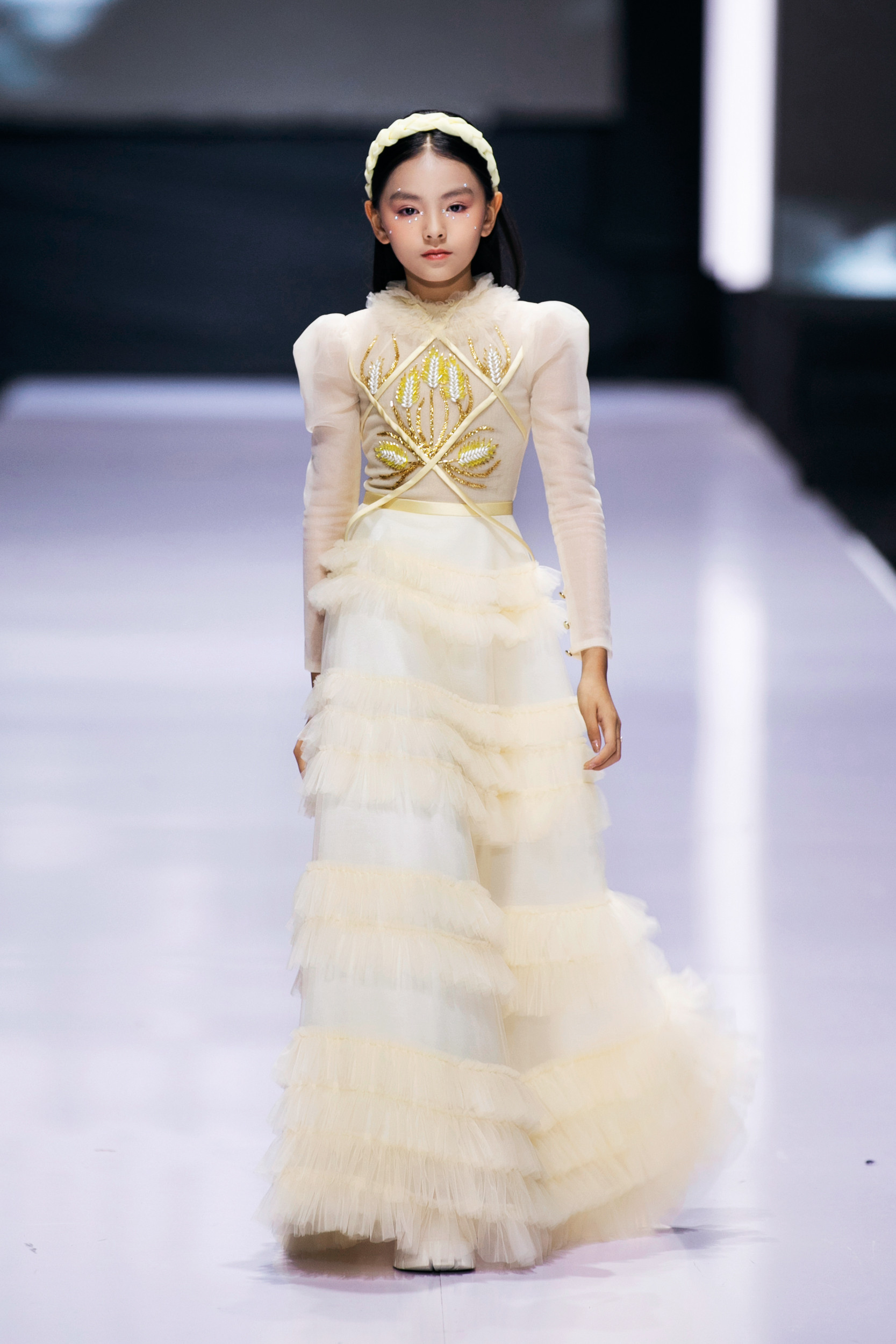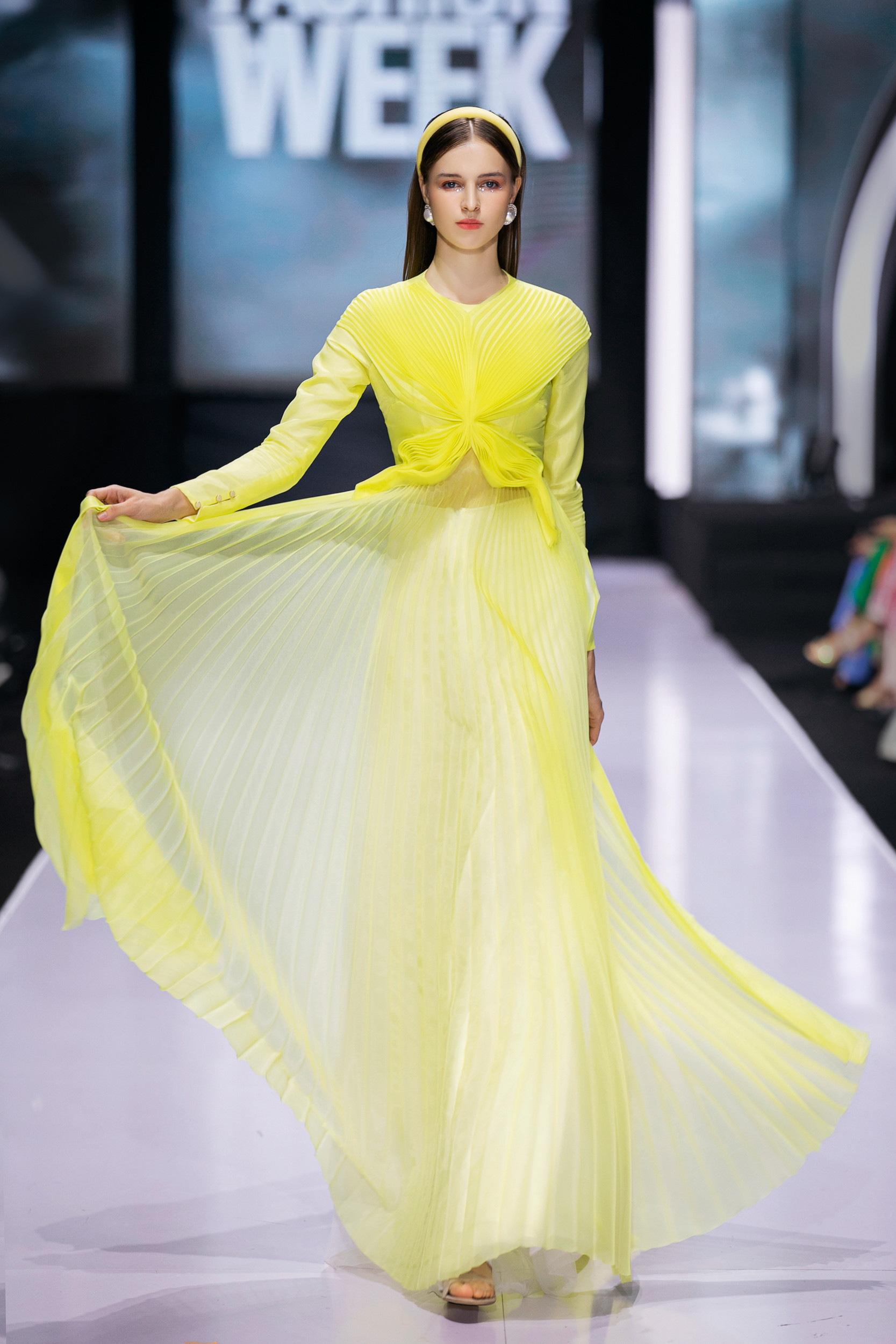 Gần 40 thiết kế được các người mẫu thể hiện sử dụng đa dạng chất liệu như lưới, taffa, lụa hay Organza và gam màu chủ đạo gồm vàng, kem, be, nâu…, đây đều là những gam màu thể hiện hình ảnh bông lúa.