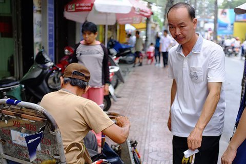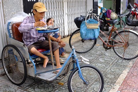 Ông đã hơn 70 tuổi, làm nghề chở thuê bằng xe ba gác. Mua cơm xong, ông cẩn thận cất lên xe, bên cạnh bịch đậu hũ tươi vừa mua. Tính ra, ông chỉ mất khoảng 8000 đồng một bữa cơm.