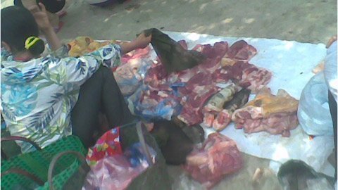 Cứ tầm 12 giờ trưa chợ lại bắt đầu họp, thịt lợn, thịt gà…đủ cả, những chiếc xe thồ to đỗ ngay đầu chợ, bên trong là những con gà đã tím tái, những tảng thịt nằm trên lớp bao tải mỏng tang đặt trên mặt đất cứ qua tay người nọ, người kia, nâng lên, hạ xuống đủ kiểu, thậm chí thịt đã bốc mùi vẫn có người mua…vì giá rẻ.