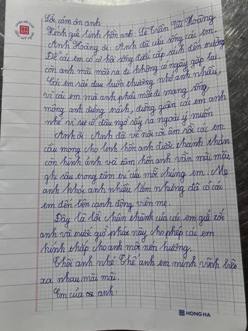 Trong thư có đoạn viết: “Anh Hoàng ơi, anh đã cứu sống các em để các em có cơ hội được sống, cắp sách đến trường còn anh mãi mãi ra đi không có ngày gặp lại.