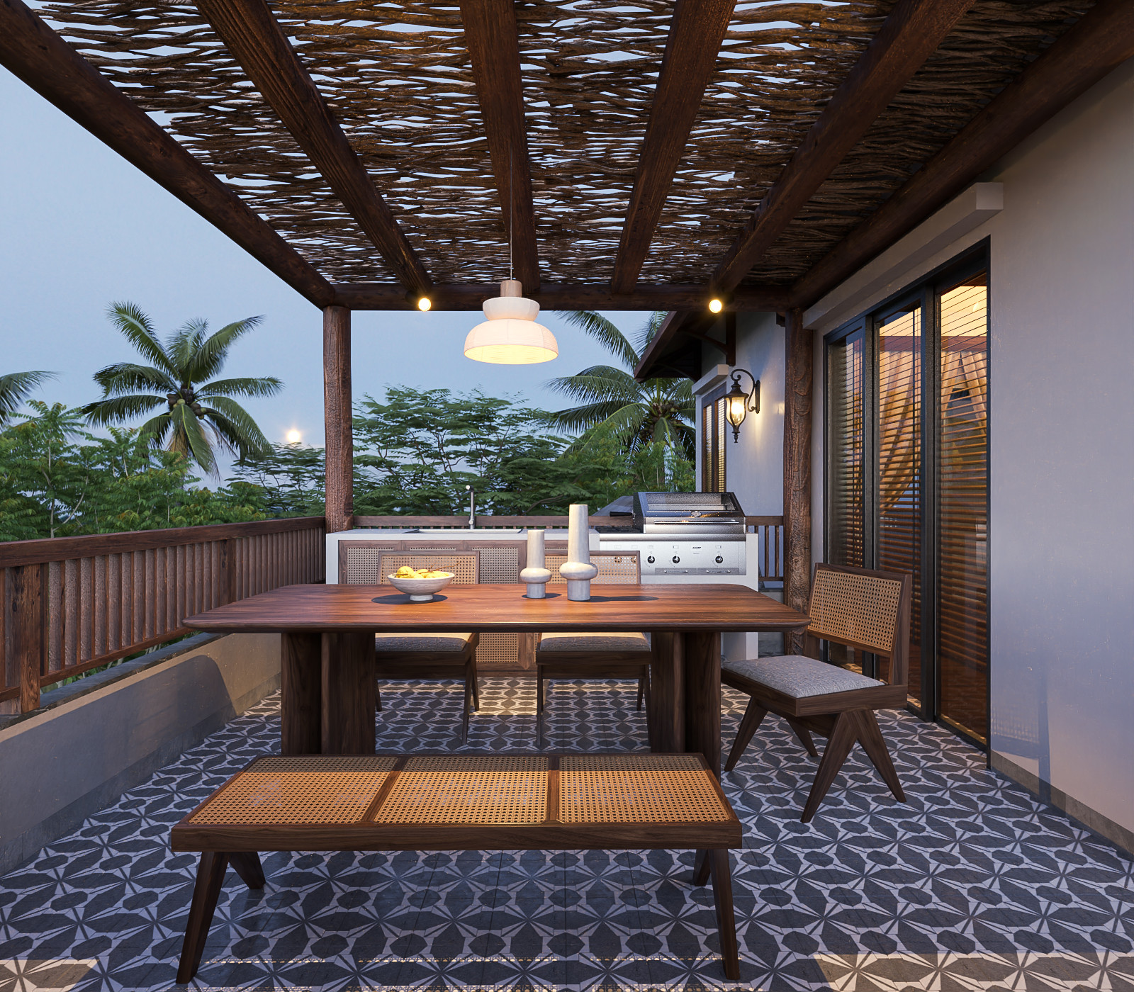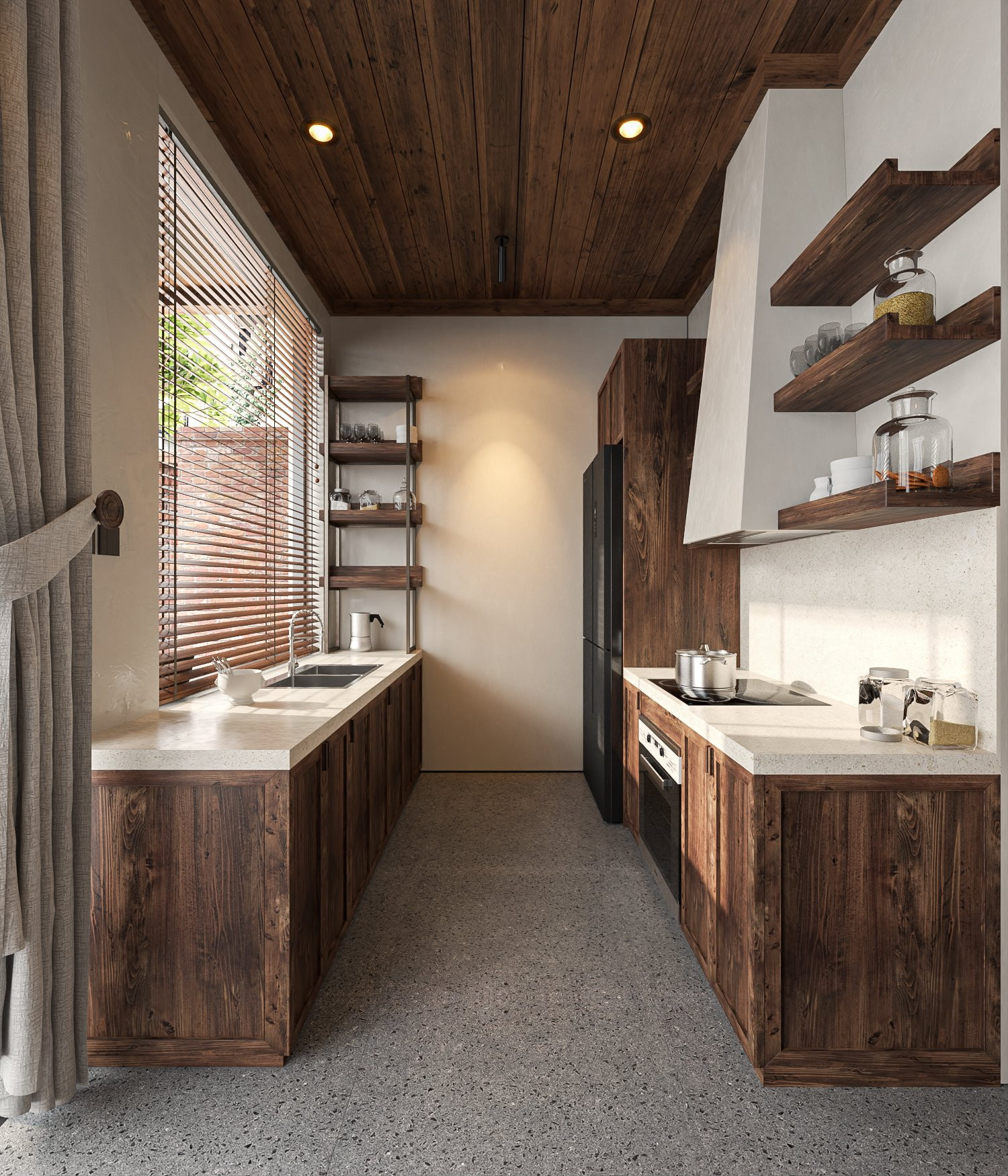 Bếp có hướng nhìn ra thiên nhiên tươi sáng. Điểm nhấn bằng gỗ, đá và những món đồ nội thất truyền thống mang đến nét duyên dáng, mộc mạc. Hài hòa với khung cảnh thiên nhiên gần gũi không thể thiếu đi hình ảnh của những vật liệu tự nhiên, thô mộc.