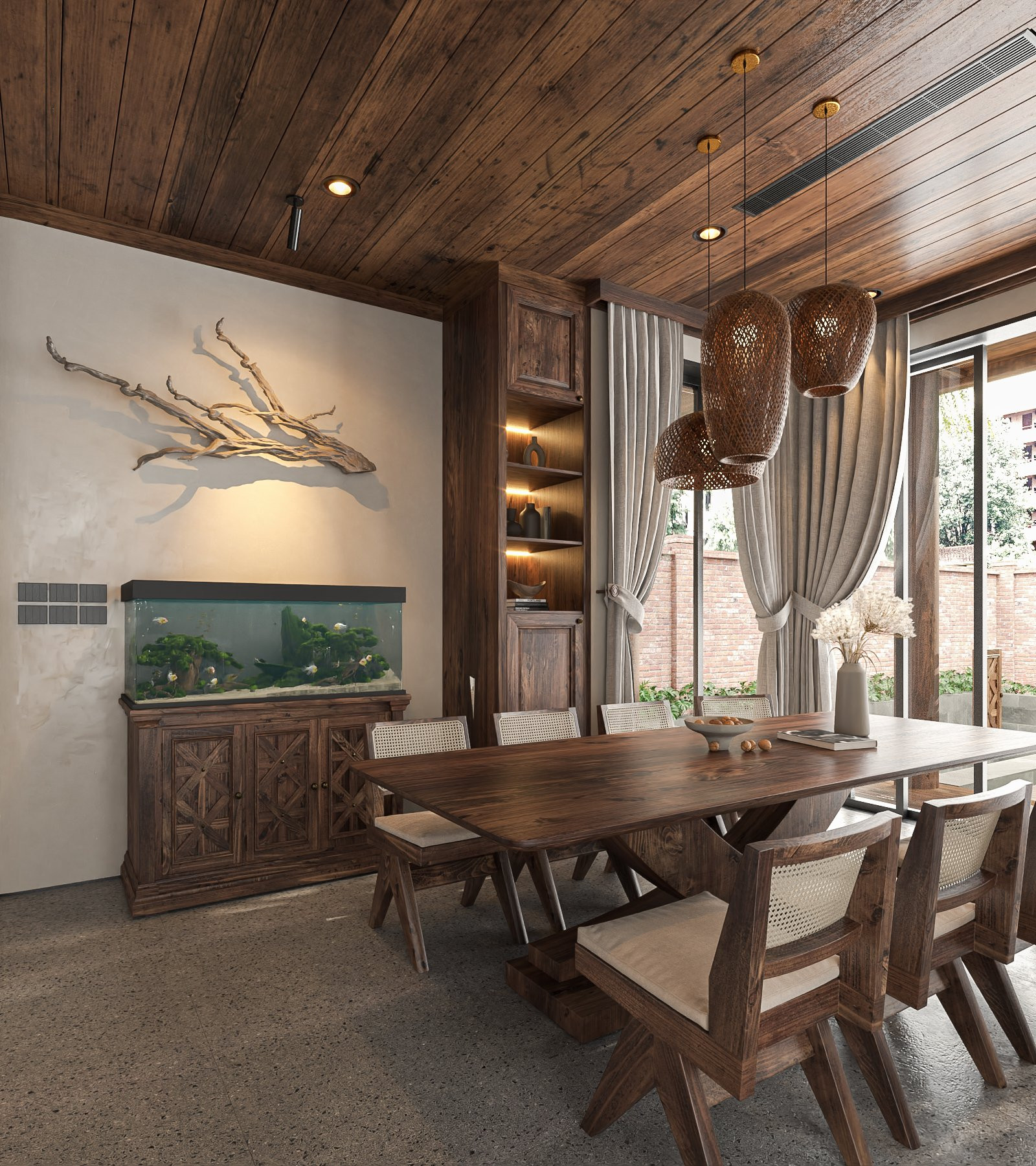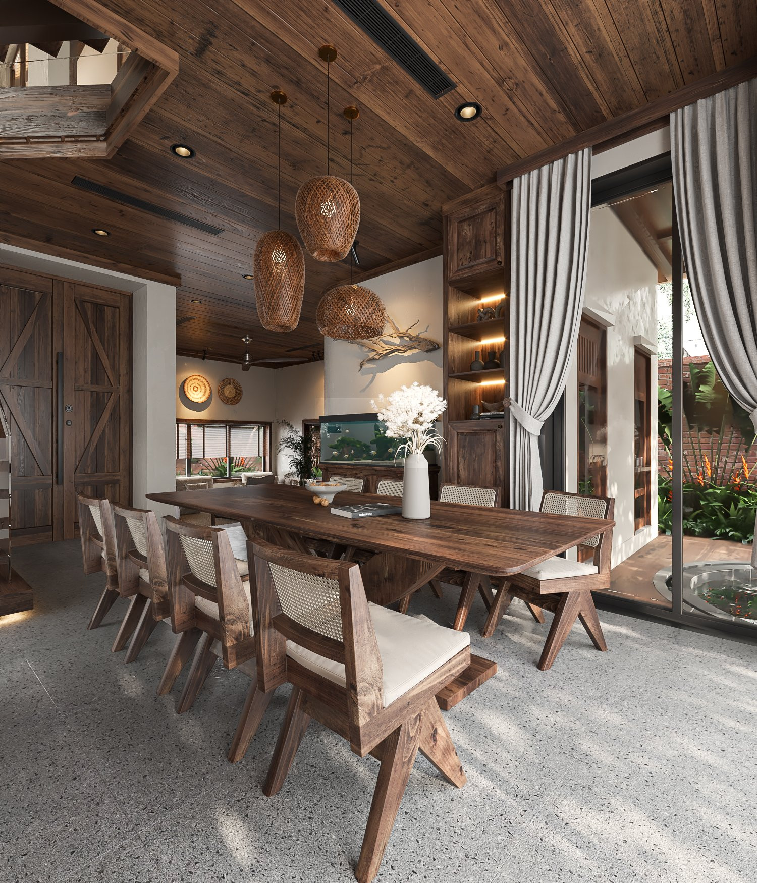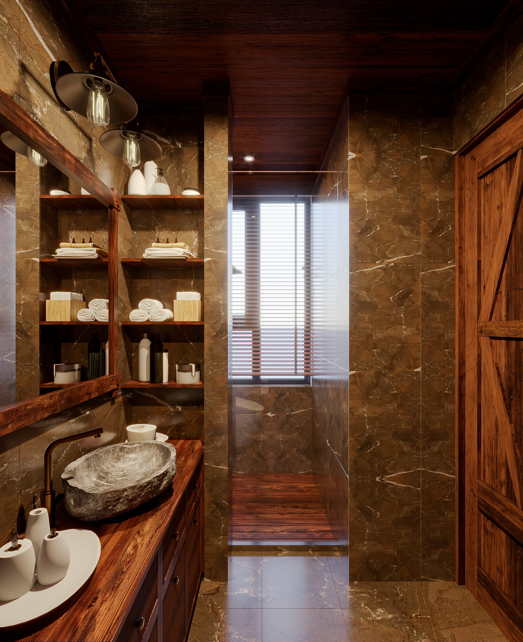 Toàn bộ công trình được phủ đầy bởi các món đồ nội thất độc đáo từ gỗ và đá, đem lại những cảm nhận mộc mạc, yên bình.