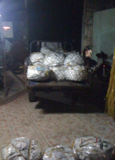 Khi chúng tôi đến đã hơn 18g nhưng lò bún bà L. vẫn đóng cửa im ỉm, trước nhà là những đống củi cao ngất dùng để đốt lò. Cạnh đó là hàng loạt chiếc rổ đã được bày đầy bún, chuẩn bị đóng bao cho khách, để ngay dưới nền nhà ướt át dơ bẩn. Dù chiếc quạt công nghiệp đang chạy hết công suất, hướng về phía những rổ bún, nhưng cũng không sao xua được đám ruồi nhặng bu đầy. Phía cuối máy ép bún là những chậu cáu bẩn chứa một loại nước có màu xanh nhạt, mà theo bà chủ lò, sau khi bún ra, sẽ chảy vào đây. Chậu nước này đã được pha sẵn một loại hóa chất để làm bún thêm trắng, dai và không dính vào nhau…