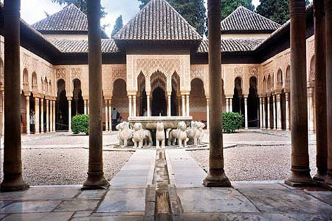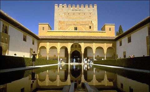 Tòa lâu đài này được xây dựng giữa thế kỉ 14, mang kiến trúc pha trộn giữa Kitô giáo và Hồi giáo, với những bức tường màu đỏ rất dễ nhận ra. Công trình từng bị bỏ hoang gần hai thế kỉ, đến thế kỉ 19 được các học giả và khách du lịch châu Âu phát hiện ra và lâu đài được phục hồi trở lại. Ngày nay Alhambra trở thành một trong những điểm thu hút khách du lịch lớn nhất Tây Ban Nha.