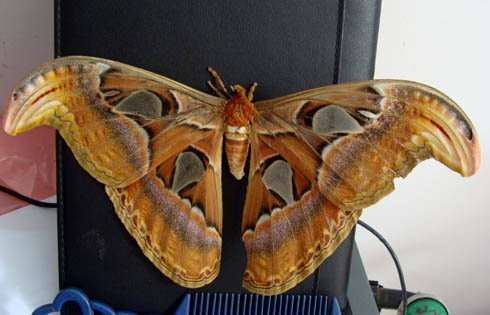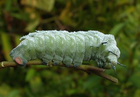 Con sâu này có màu xanh lét, với hàng gai có phấn trắng tua tủa trên lưng. Nó nhai lá phát ra tiếng kêu. Khu vực có con sâu bám, lá dâu da bị ăn xơ xác, tơi bời. Theo anh Thùy, có thể con sâu đó đóng kén, rồi kén đó vừa nở ra bướm. Con bướm này mới nở thì bay lạc vào nhà chị Tuyết. Mặc dù mới nở, song nó đã có kích cỡ khổng lồ như thế.