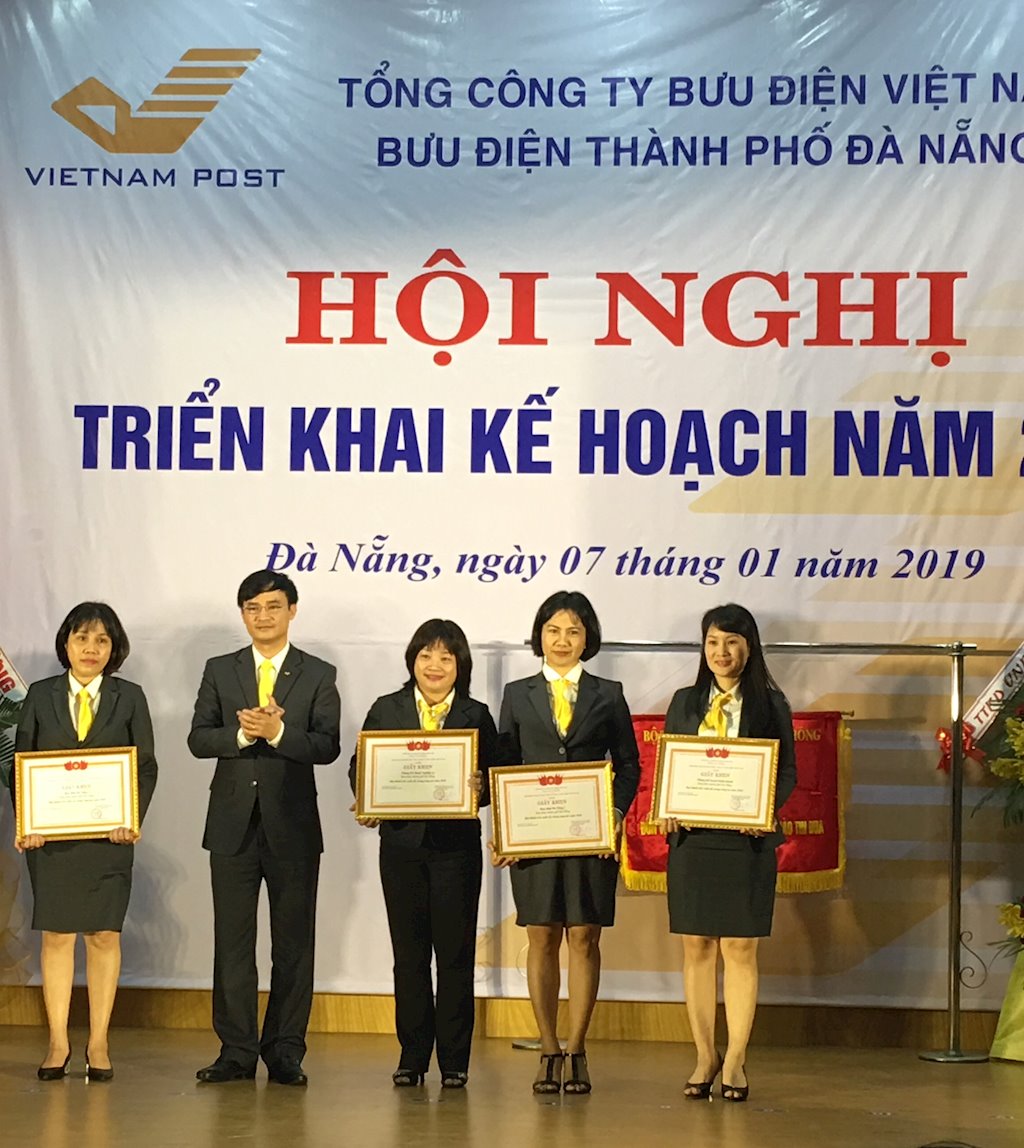 Ông Nguyễn Minh Đức, Phó Tổng Giám đốc VNP trao giấy khen của VNP cho các đơn vị trực thuộc Bưu điện Đà Nẵng đã hoàn thành xuất sắc nhiệm vụ năm 2018. |