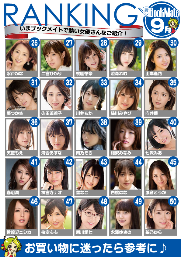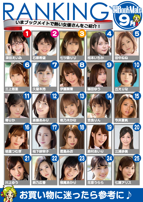 Đến hẹn lại lên, hệ thống cửa hàng Bookmate tại Nhật Bản đã công bố bảng xếp hạng 100 nữ diễn viên ăn khách nhất trong tháng 9. Được biết, cứ vào đầu tháng sau, chuỗi cửa hàng này sẽ lại liệt kê danh sách top 100 lần để người hâm mộ có thể biết được tên tuổi ăn khách nhất trong tháng trước.