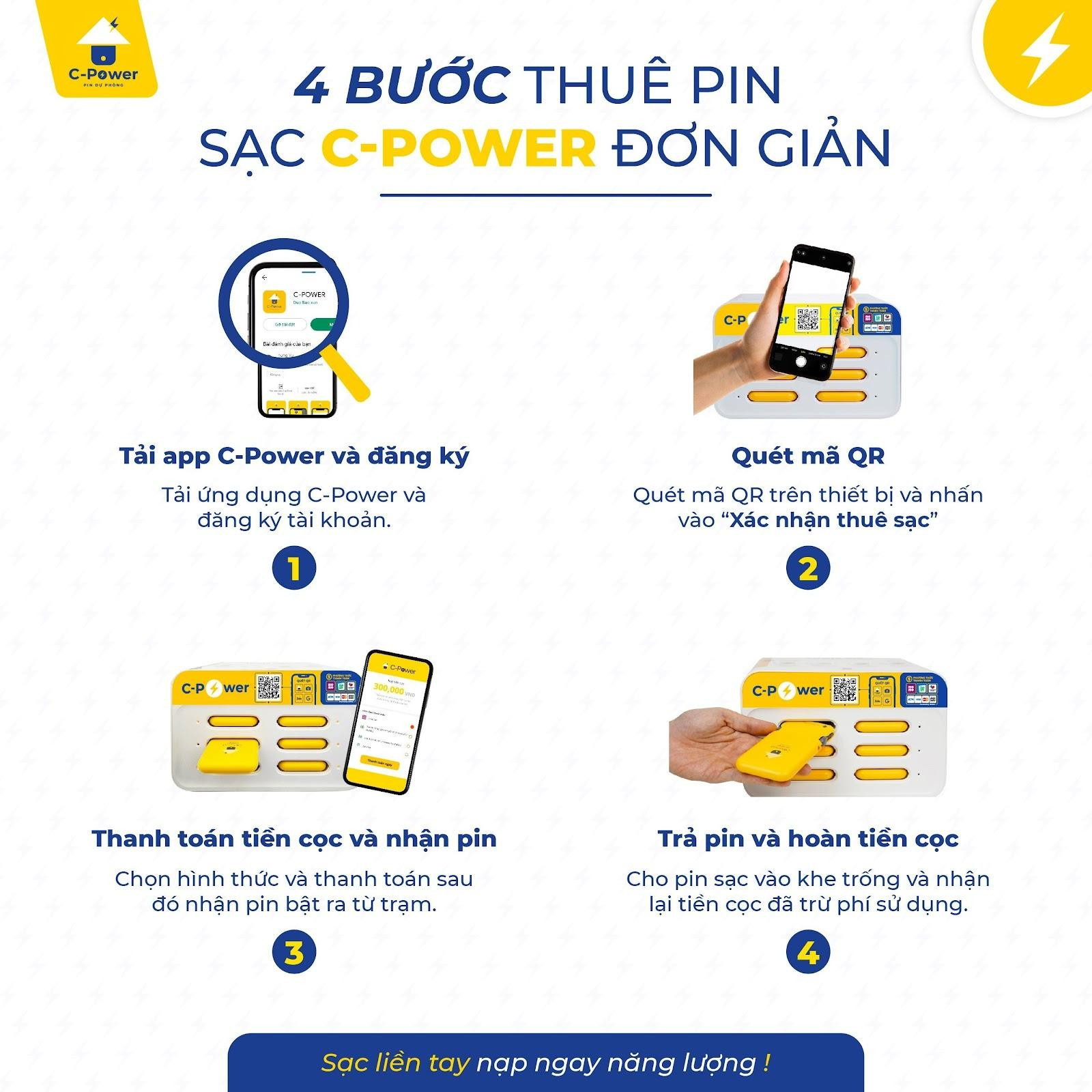 Cách sử dụng dịch vụ thuê pin sạc của C-power đơn giản, dễ dàng với các bước như sau: