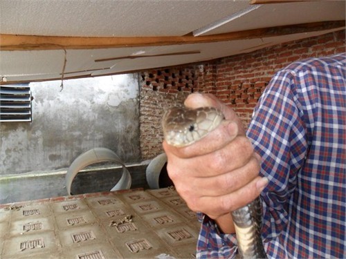 sắt có uốn cong đầu, kéo con rắn lên, tay kia thì lần tóm giữ lấy đầu rắn rất
