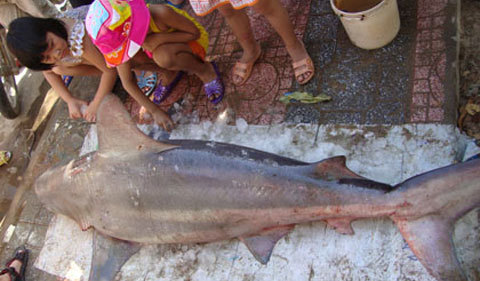 Con cá mập được gia đình ông Phan Văn Dầu bắt được vào sáng 12/6 (Ảnh: Dân trí)