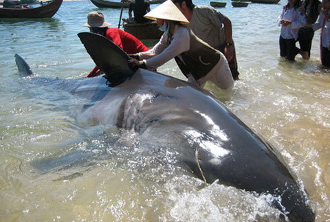 Ngư dân Phan Văn Dầu (52 tuổi, phường Trần Phú, TP. Quy Nhơn) cho biết, vào khoảng 4h sáng nay, khi đi kiểm tra lưới cách bờ khoảng 100m thì bất ngờ phát hiện một con cá mập trắng vẫn còn sống mắc kẹt trong lưới. Ông Dầu đã phải hô gọi một số người quen trợ giúp để đưa cá vào bờ.