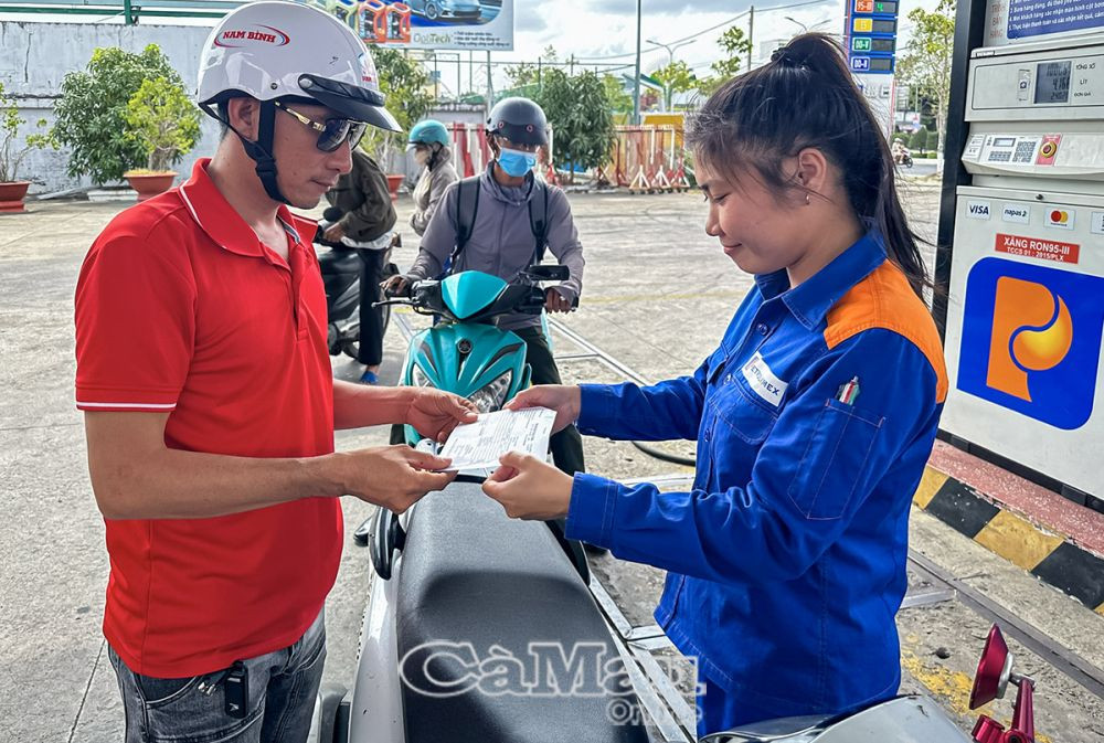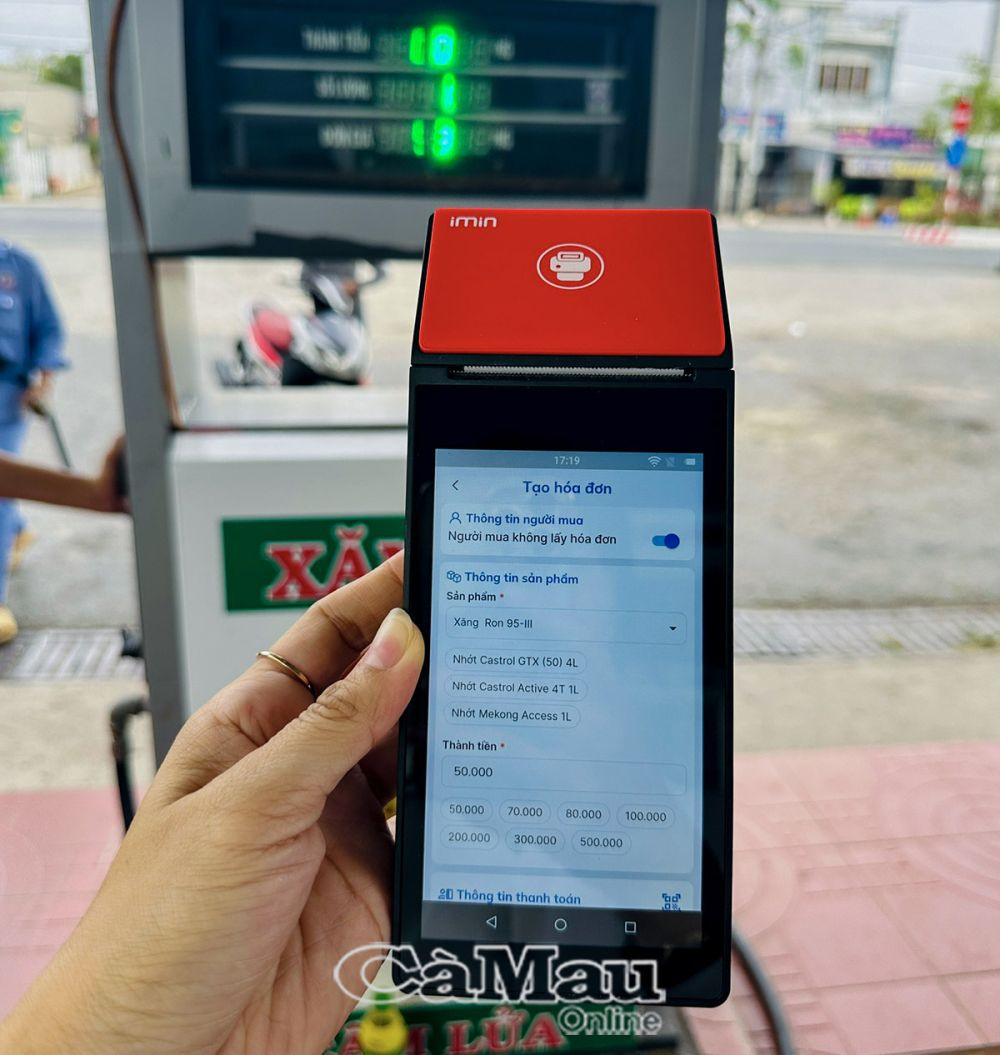 Chỉ vài thao tác đơn giản, nhanh chóng, khách hàng có thể nhận hoá đơn khi đến bơm xăng. (Ảnh chụp tại Cửa hàng Xăng dầu số 5, Công ty Xăng dầu Cà Mau).