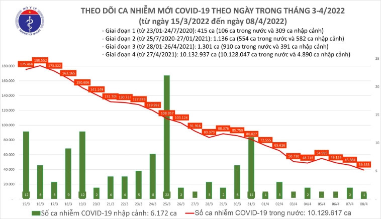 Theo Bộ Y tế, trong 24 giờ qua, cả nước có 39.334 ca nhiễm mới tại 62 tỉnh thành, giảm 6.551 ca so với hôm qua. Trong số nhiễm mới, có 1 ca nhập cảnh, 39.333 ca trong nước, gồm 27.889 ca cộng đồng.