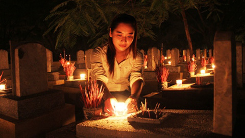 | Các phần mộ lung linh dưới ánh nến hồng tại nghĩa trang liệt sĩ Bình Chánh - Bình Tân (Q.Bình Tân, TP.HCM). (Ảnh: Thanh niên) |