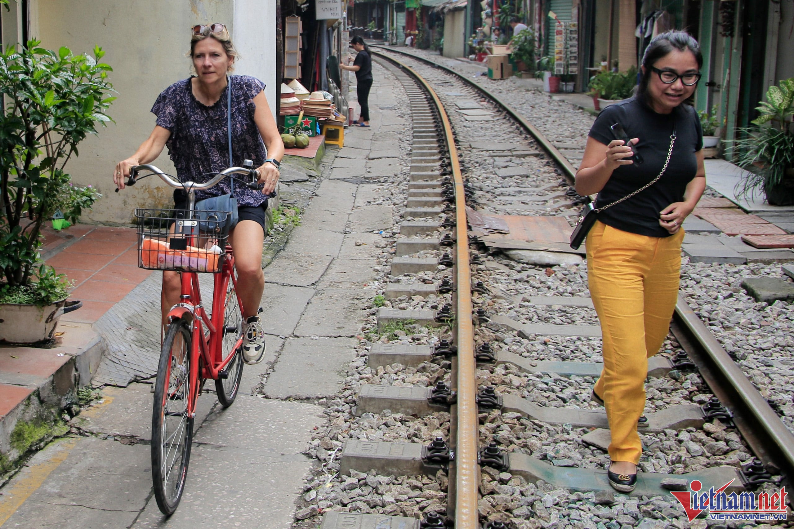 Những vị khách quốc tế đến check-in xóm cà phê đường tàu Phùng Hưng (Hà Nội) không chỉ ngồi uống cà phê mà còn đạp xe đi dạo xung quanh để trải nghiệm nét đặc biệt của khu vực này.
