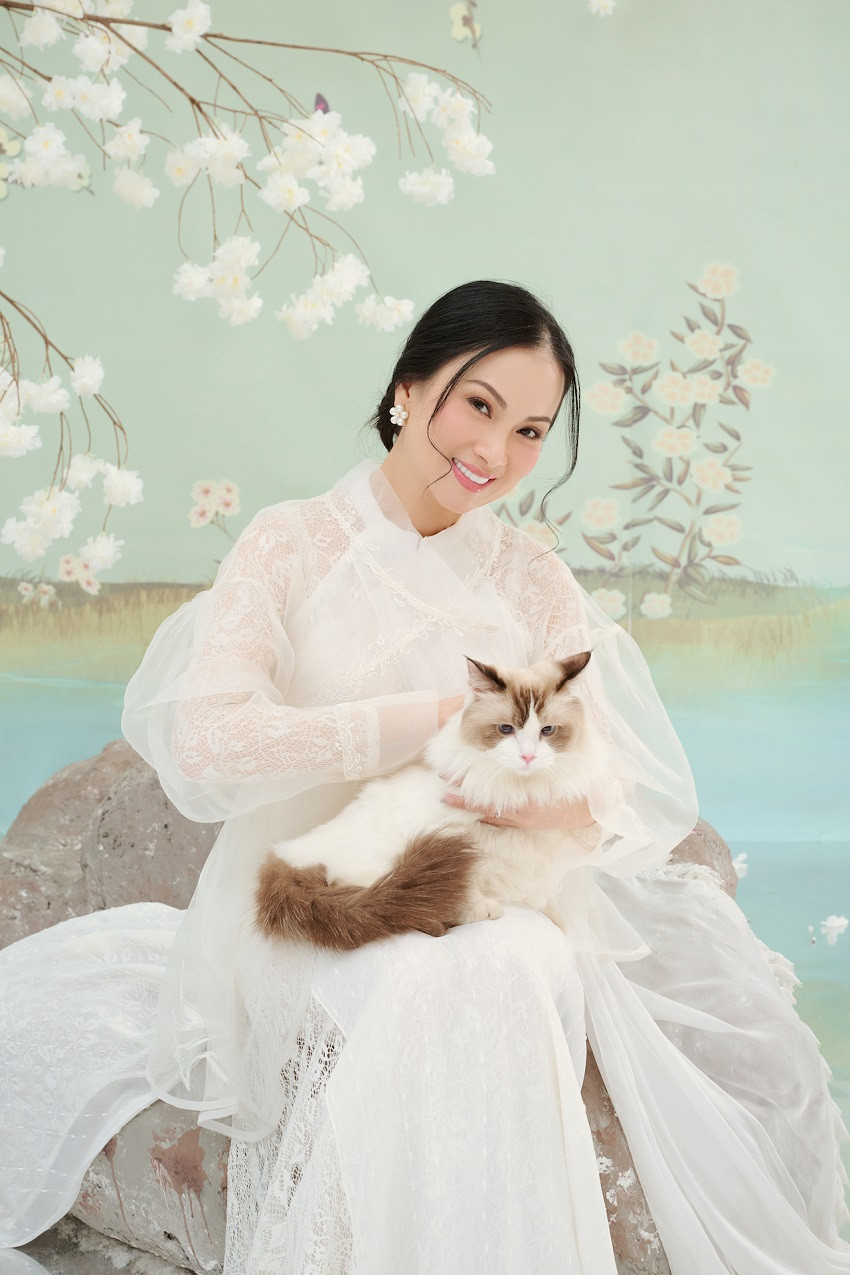 'Ca sĩ tỷ phú' Hà Phương đã trở về Việt Nam ăn Tết cùng gia đình. Cũng trong dịp này, cô rủ hai người bạn tri kỷ là ca sĩ Trần Sang và tài tử điện ảnh Thái San chụp bộ ảnh đón Tết. Trong trang phục truyền thống, cô khoe được vóc dáng thon gọn toát lên sự thanh khiết, dịu dàng.Hà Phương bên mèo cưng. Điểm nhấn của bộ trang phục này là phần cánh tay phồng tạo sự trẻ trung nhưng không kém phần tinh tế, sang trọng.Hà Phương tiết lộ bí quyết giữ gìn thanh xuân và vóc dáng, đó chính là sự thoải mái, vui vẻ, không tạo áp lực cho mình chính. Nữ ca sĩ cho rằng, đây là “liều thuốc” hữu hiệu nhất dành cho chị em phụ nữ.