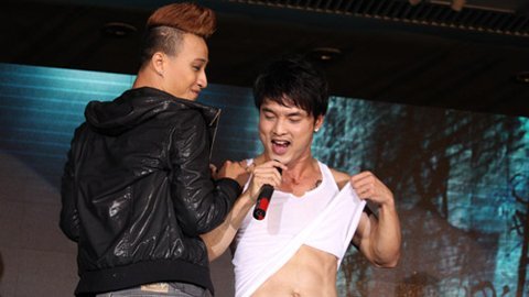 | Trong một buổi ra mắt MV mới, Ưng Hoàng Phúc khiến khán giả sốc nặng khi vén áo khoe ngực bên một vũ công nam. |