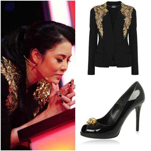 Trong buổi ghi hình vòng Giấu mặt, Thu Phương diện blazer phủ chi tiết kim loại tinh xảo có giá bán gần 160 triệu đồng, đi cùng giầy cao gót cùng thương hiệu có giá hơn 18 triệu đồng.