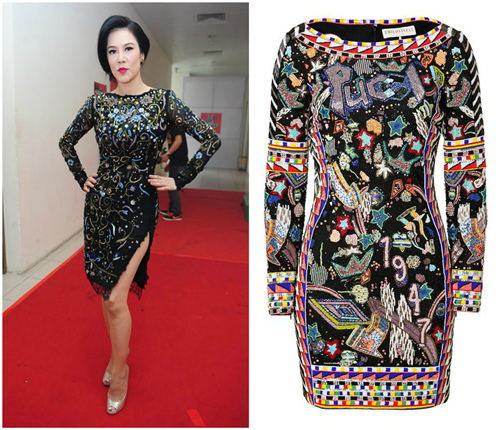 Danh sách váy áo hiệu còn được nối dài bởi thiết kế đầm ngắn Emilio Pucci ôm sát gợi cảm, kết đính công phu có giá niêm yết đến 185 triệu đồng.