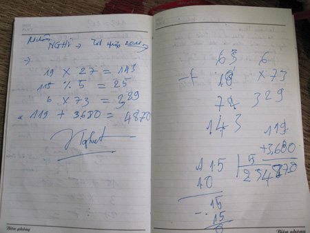 | Phần tính toán nháp, cùng kết quả phép tính và chữ kí