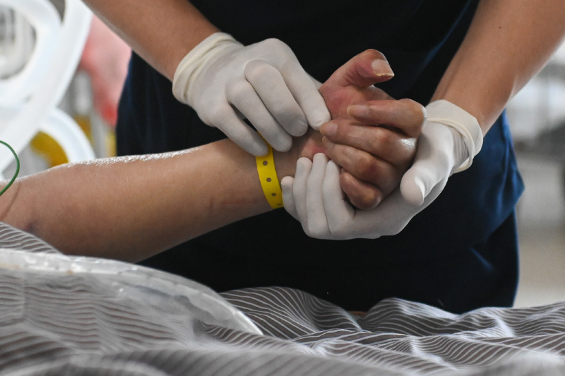 Trước khi vào viện 3 ngày, ông H. xuất hiện ho khan, sốt, khó thở, ban đỏ nổi từ mặt xuống thân nên được đưa vào nhập viện. Bốn ngày sau, bệnh nhân khó thở tăng dần, được chuyển đến Khoa Hồi sức tích cực (Viện Y học Nhiệt đới) với chẩn đoán sởi biến chứng viêm phổi, được xử trí thở HFNC nhưng không đáp ứng nên phải đặt ống nội khí quản, thở máy.