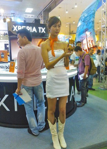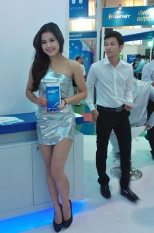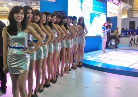 Triển lãm Mobile Vietnam 2012 cũng không phải là ngoại lệ khi các gian hàng lớn nhỏ đều quy tụ rất nhiều P-G. Thậm chí năm nay, nhiều doanh nghiệp đã chơi “trội” thuê hẳn người mẫu ngoại quốc để làm điểm nhấn cho gian hàng của mình.