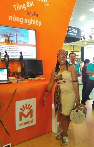 Nữ "thổ dân" Mozambique cùng chiếc trống lạ mắt là điểm nhấn tại quầy Movitel của gian hàng Viettel.