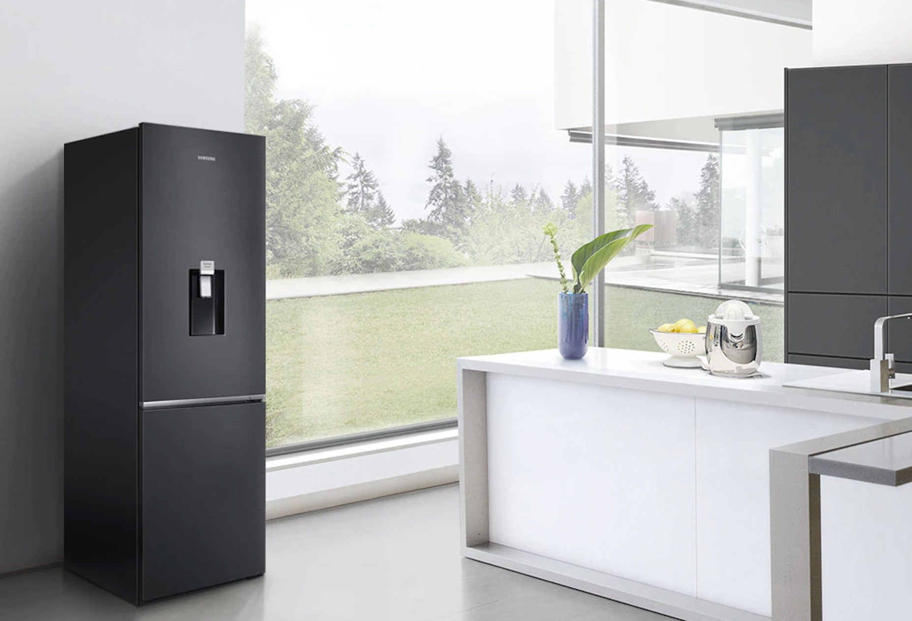 Dòng tủ lạnh 2 cánh Inverter của Samsung có thiết kế đơn giản, mặt gương đen sang trọng với các góc cạnh vuông.