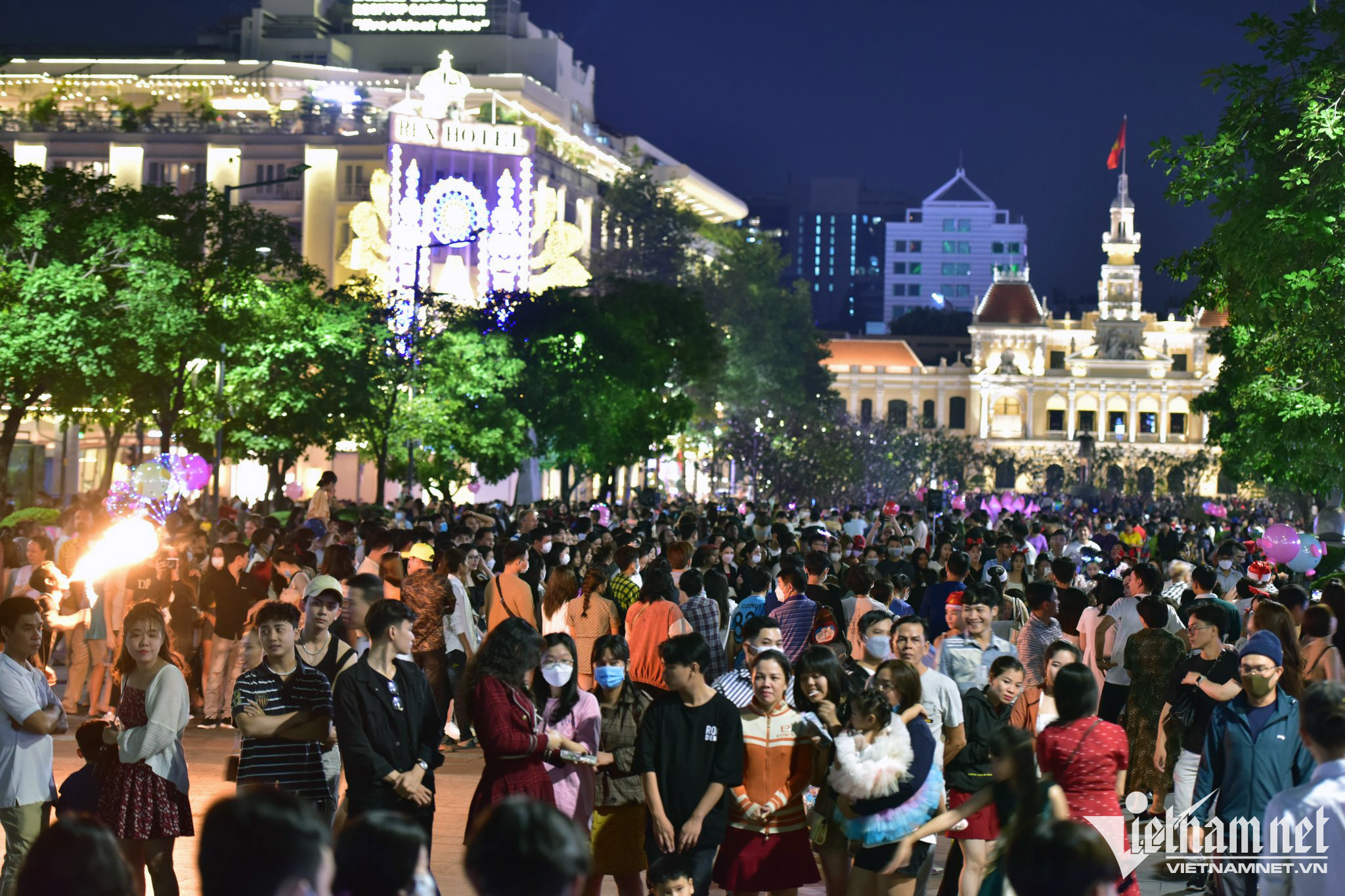Người dân tập trung vui chơi tại khu vực tòa nhà Diamond gần Dinh Độc Lập và Nhà thờ Đức Bà.