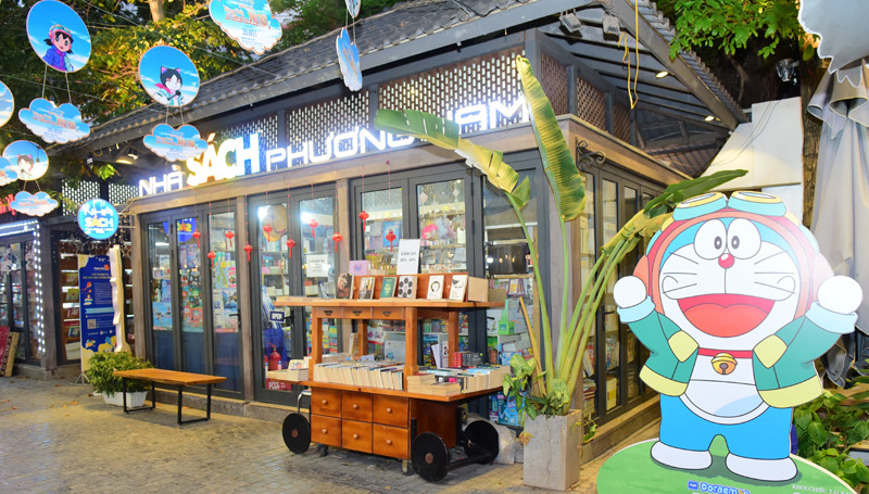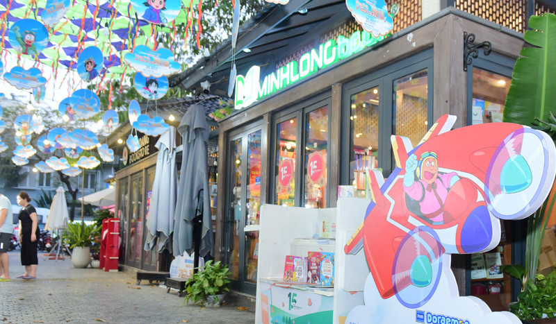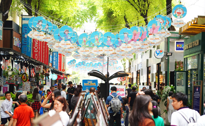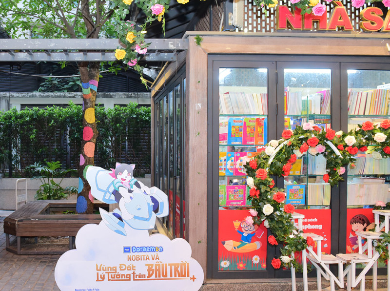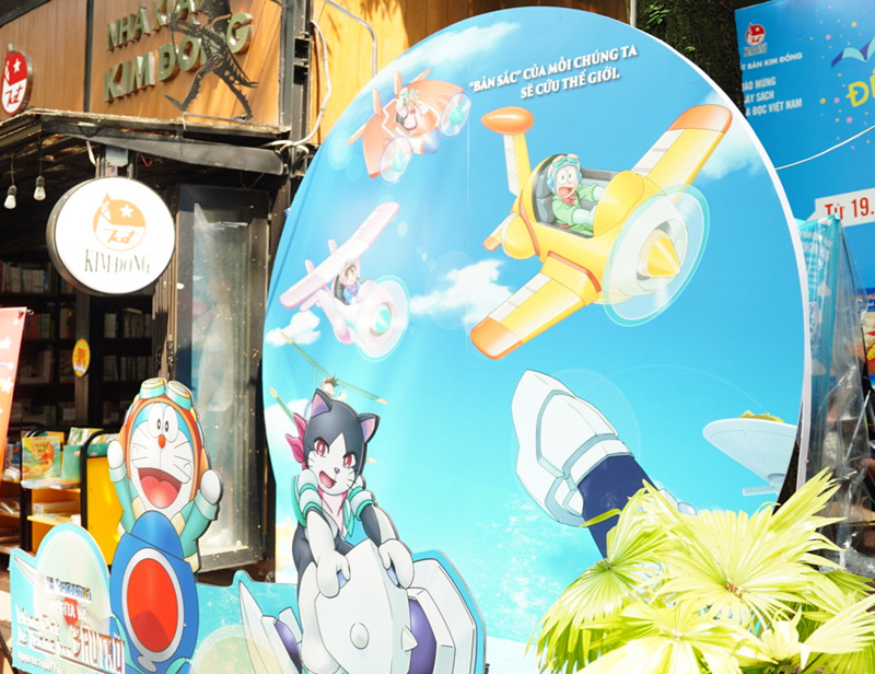 Hình ảnh các nhân vật quen thuộc trong thương hiệu truyện tranh và hoạt hình Doraemon xuất hiện cùng lúc ở Phố sách Hà Nội và Đường sách Nguyễn Văn Bình TP.HCM.
