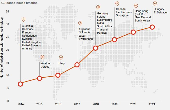 Tiếp sau đó, một vài quốc gia như Argentina, Colombia, Nhật Bản, Thụy Sĩ cũng ban hành những hướng dẫn đầu tiên vào năm 2017. Đến năm 2018, danh sách này có thêm Đức, Ireland, Luxembourg, Nam Phi, Bồ Đào Nha.