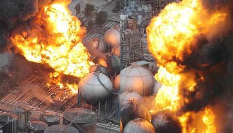 Lửa bùng lên từ một nhà máy lọc dầu ỏ Ichihara, Chiba, Nhật Bản sau động đất hôm 11/3. (Ảnh: AP)