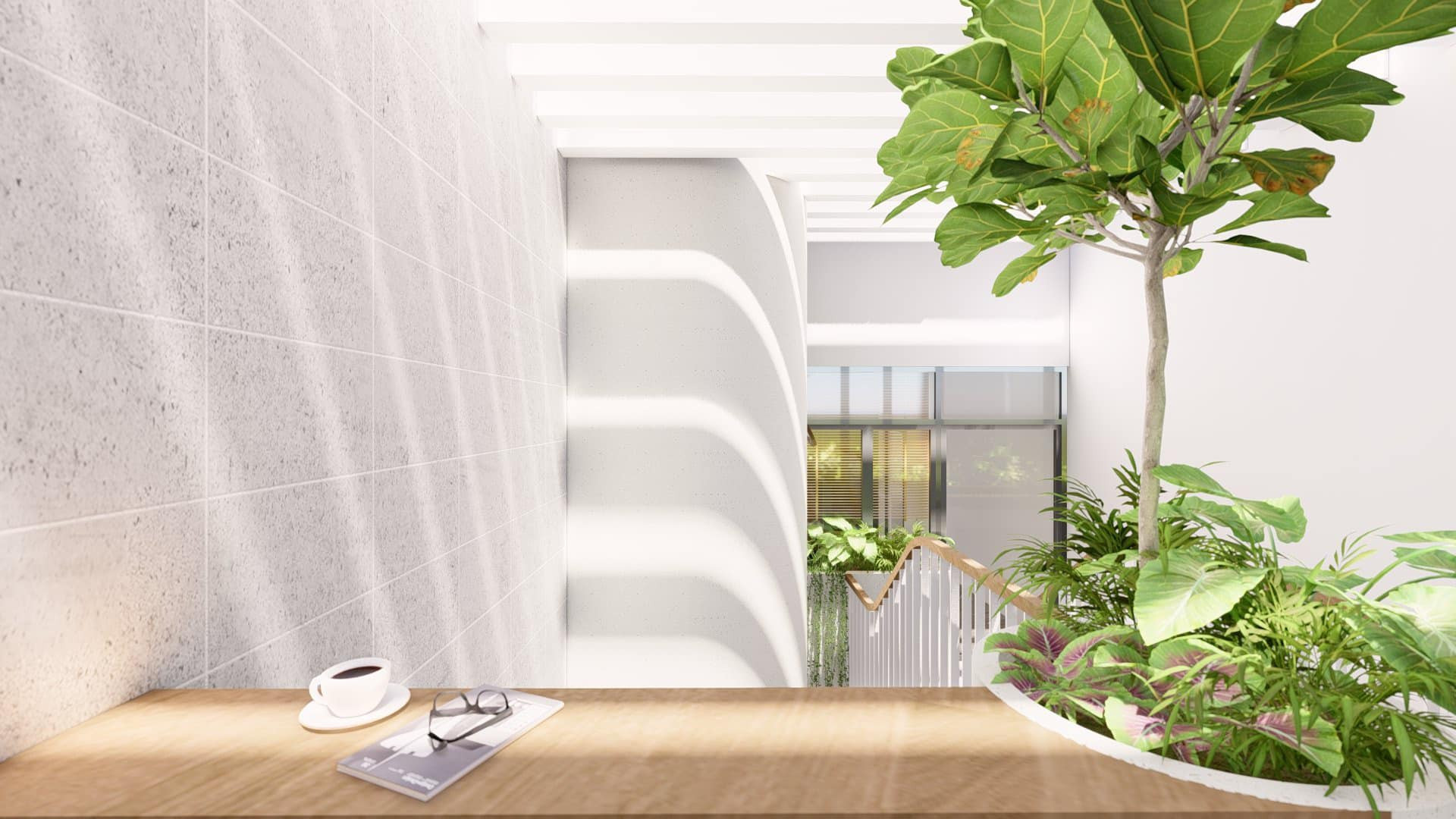 Cầu thang đá mài, có độ bám dính tốt, tránh trơn trượt. Giữa phòng khách và bếp là một giếng trời nhỏ, bên trên có cửa kính đẩy ra được theo nhu cầu sử dụng. Phía dưới là hồ nước điều hòa trồng hoa súng, hoa sen. Nhóm thiết kế cho đặt bộ bàn uống trà nhỏ, tạo thành góc chill, thư giãn cho mọi người. Cây xanh ưu tiên bố trí ở nơi nhiều ánh nắng.