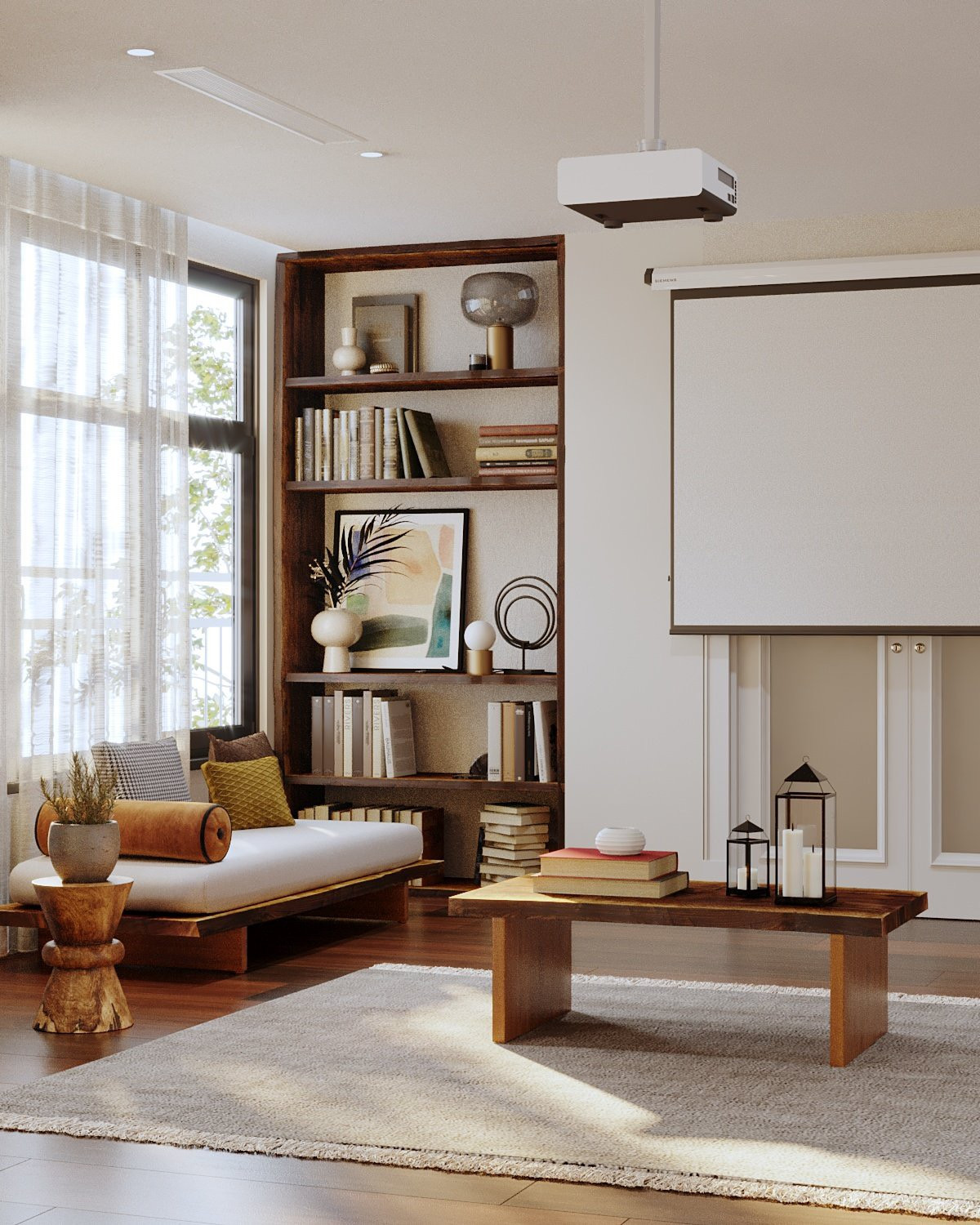 Bộ sofa trắng bo cong tạo điểm nhấn cho không gian. Màu trắng được nhấn thêm màu vàng và nâu của gối tựa. Chiếc đôn gỗ nhỏ tạo khối độc đáo, bày chậu cây nhỏ cho nhà thêm sinh động. Phía sau là mảng tường thạch cao nổi, ốp gỗ, tạo góc riêng biệt cho ban thờ. Gần khu vực ban thờ nhóm khoét 1 ô nhỏ làm tranh tường ấn tượng và bố trí góc đọc sách lãng mạn ở đây. Kệ gỗ kết hợp chậu cây nhỏ khiến không gian thêm dễ chịu, thư thái. Góc cửa sổ cũng có thêm 1 kệ sách và ghế văng dài. Nhà có ban công chạy dài nên phòng nào cũng có ánh sáng. Nhà không dùng tivi nên nhóm bố trí máy chiếu gọn gàng. Khi cần kéo xuống là thành rạp chiếu phim mini tại gia, sau đó có thể kéo gọn lên. Khu vực này cũng là cửa thông phòng, vào nơi nghỉ ngơi, thư giãn. Nội thất đơn giản nhưng không kém phần hấp dẫn, thẩm mỹ.