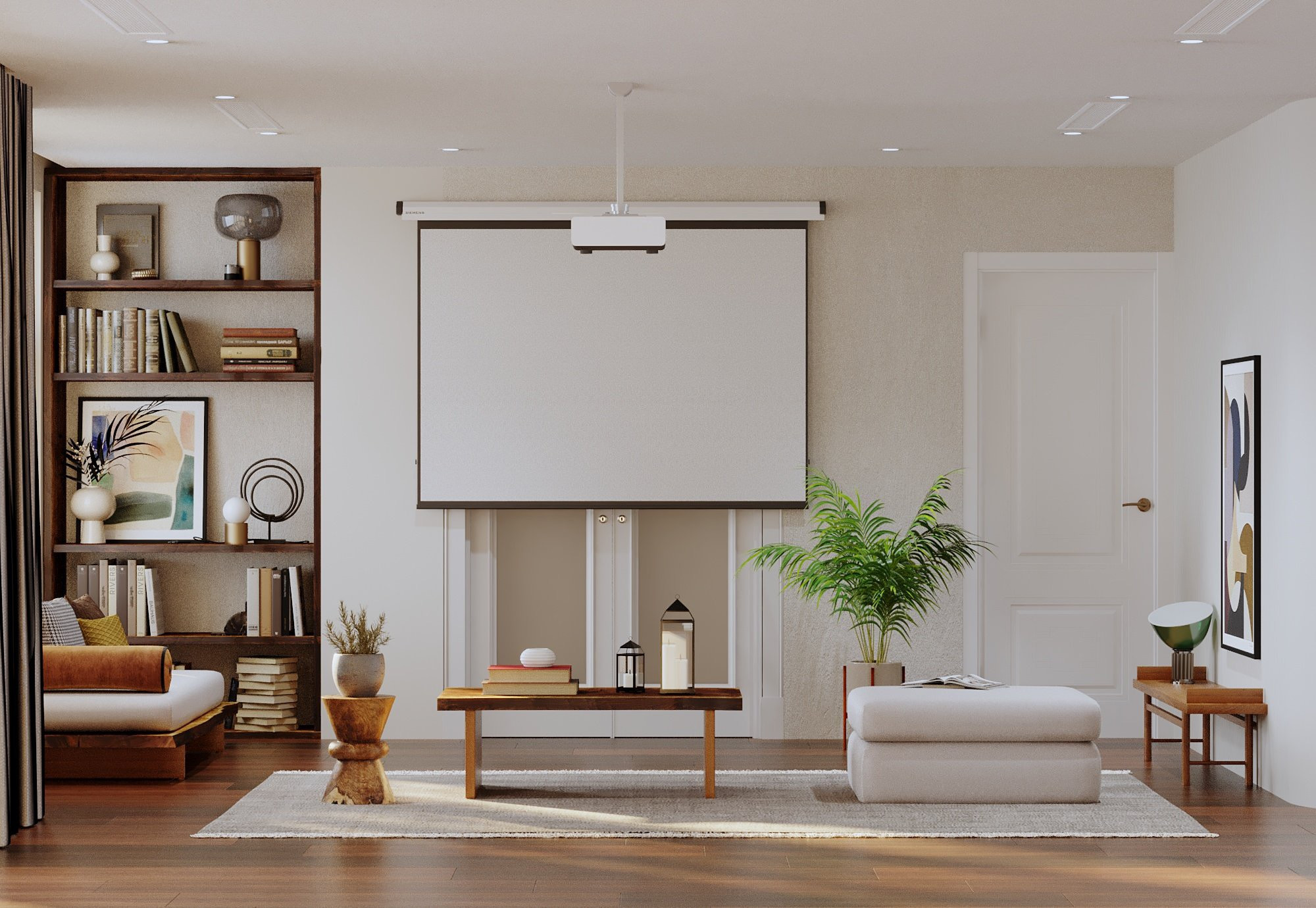 Bên cạnh thiết kế thoáng đãng, tiện nghi, gia chủ đưa ra yêu cầu, nội thất tinh tế, nhẹ nhàng nhưng không khô cứng, đơn điệu. Phòng khách thay vì dùng tivi, họ sẽ lắp máy chiếu, phục vụ nhu cầu giải trí khi cần thiết.