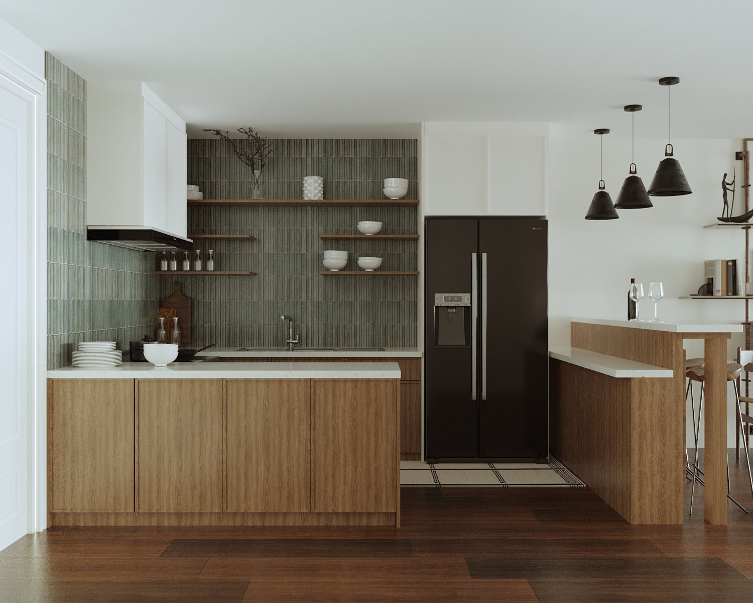 Với cách bố trí đơn giản nhưng nhóm thiết kế đã tạo ra không gian phòng khách và bếp thoáng đãng, rộng rãi mà vẫn đảm bảo độ sang trọng, thẩm mỹ.