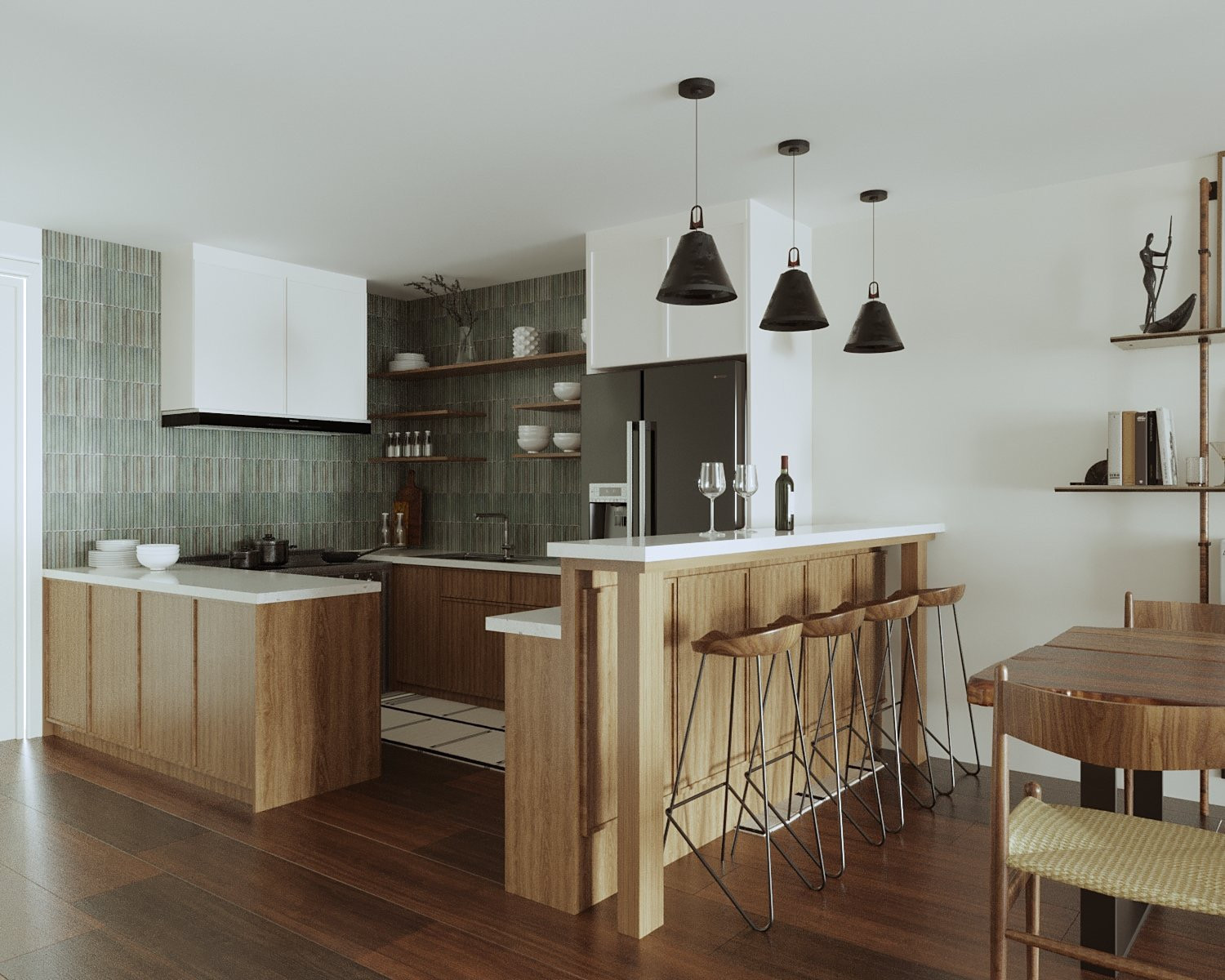 Căn bếp nhỏ hình chữ U nhưng ngập tràn tiện ích. Ngoài bàn ăn, nhóm đặt 1 bàn đảo kiêm quầy bar xinh xắn, phục vụ những lúc gia chủ muốn nhâm nhi ly rượu vang. Ở đây, kiến trúc sư sử dụng đèn thả trần hình loa, màu đen.