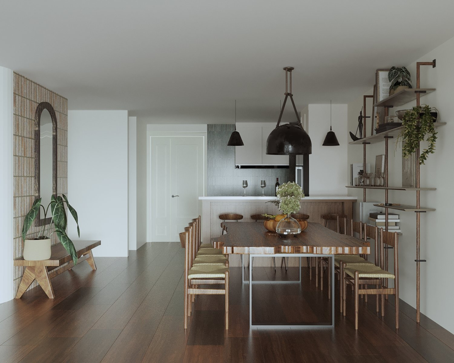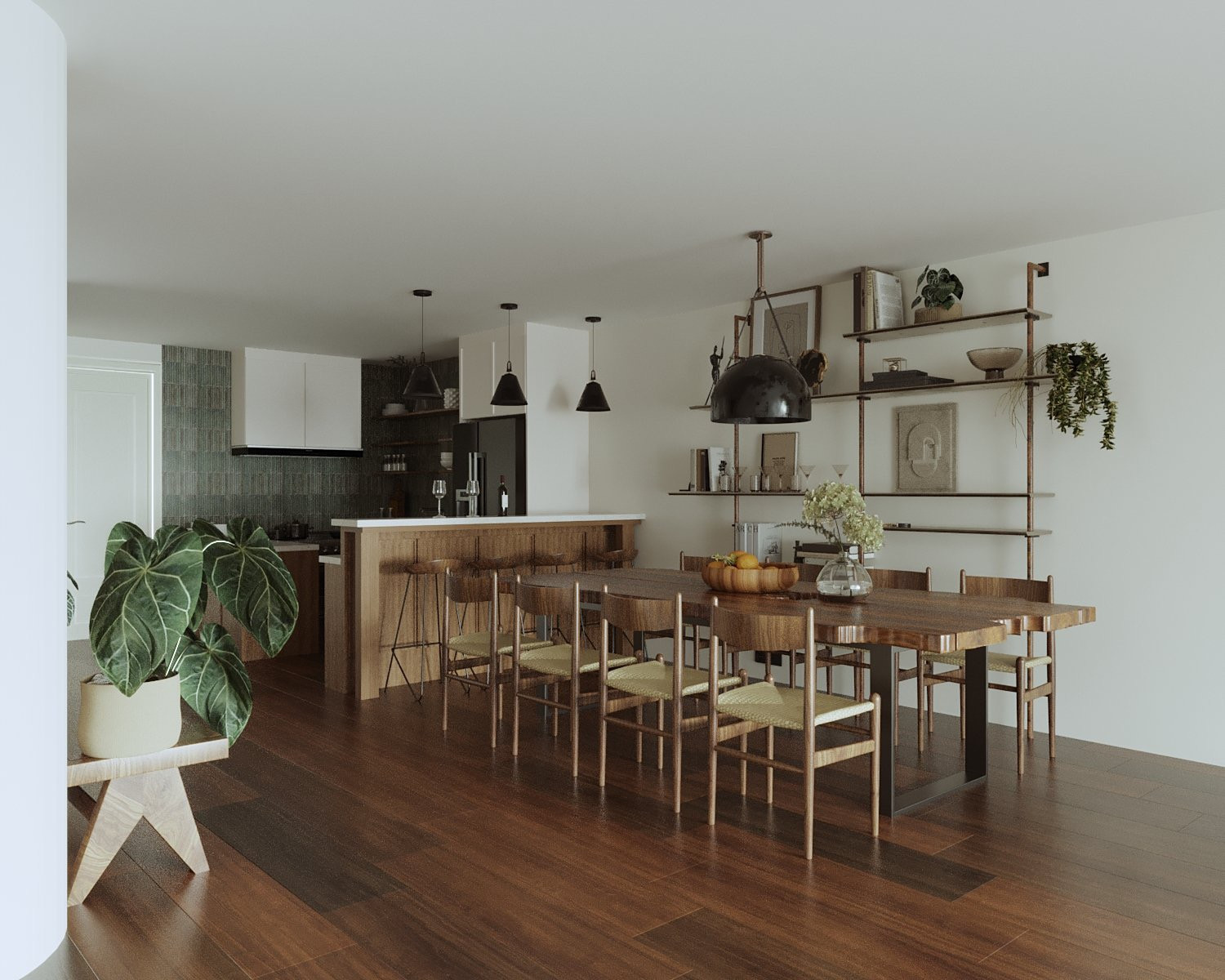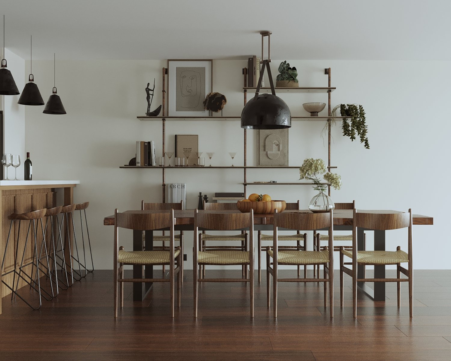 Mọi người có thể tham khảo cách bố trí khoa học này. Bộ bàn ăn rộng đủ cho 8 người, nếu như tủ bếp là khối kín thì bàn ăn và kệ đằng sau sẽ làm thoáng, chi tiết thanh mảnh tạo đối xứng đẹp mắt. Màu nâu nhạt cũng tạo cảm quan ấm cúng về mặt thị giác mà không bị tối.