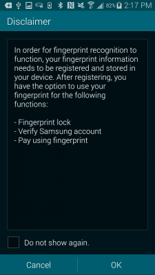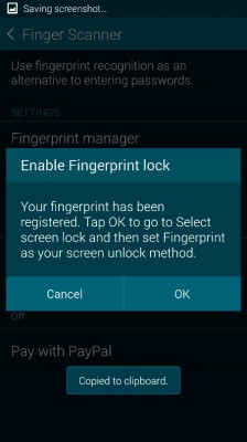 Sau khi bạn hoàn thành, dấu vân tay của bạn sẽ được lưu vào hệ thống, Galaxy S5 sẽ yêu cầu bạn nhấn “OK” để chọn kích hoạt tính năng mở khóa bằng dấu vân tay.