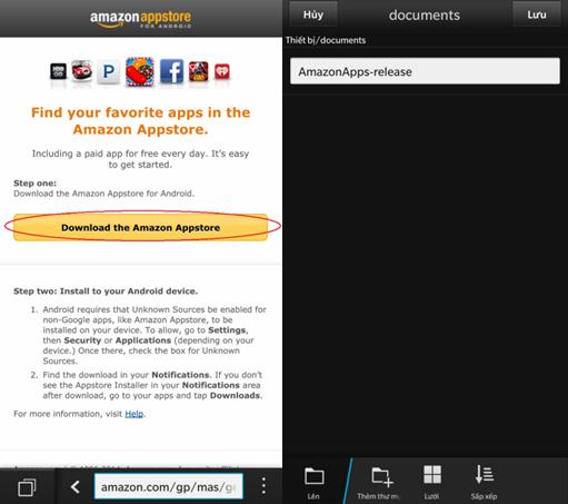 1. Trên điện thoại BlackBerry Z10, trong trình duyệt, bạn click tại đây để tải về Amazon Appstore. Click nút “Download the Amazon Appstore”