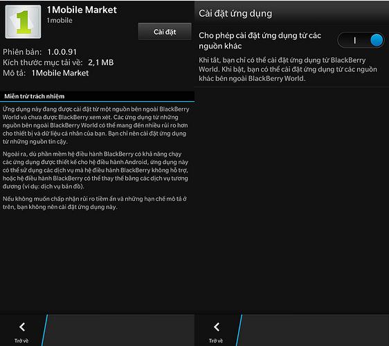 b. Tiếp tục chọn “Cài đặt” để cài kho ứng dụng “1MobileMarket” lên Z10. Khi thông báo xin quyền truy cập của ứng dụng hiện ra, bạn chọn “Chấp nhận”. Khi kho ứng dụng này được cài đặt xong, nút “Mở” sẽ xuất hiện.