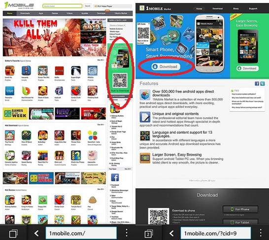 1. Trên điện thoại BlackBerry Z10, trong trình duyệt, bạn mở trang web: 1Mobile.com, nhìn bên tay phải, bạn sẽ thấy khung “1Mobile Market”. Click vào khung này, trang web mới sẽ hiện ra, bạn chọn nút “Download” ở khung dành do Smartphone (bên trái).Lúc này, tab “downloads” sẽ hiện ra, bạn chọn “Lưu” file “1MobileMarket_i”
