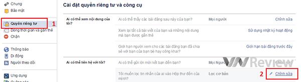 Tiếp theo, trong mục cài đặt bạn chọn vào 'Quyền riêng tư', nhìn sang giao diện bên phải mục 'Ai có thể liên hệ với tôi', bạn chọn tiếp 'Chỉnh sửa' tại phần 'Lọc tin nhắn'
