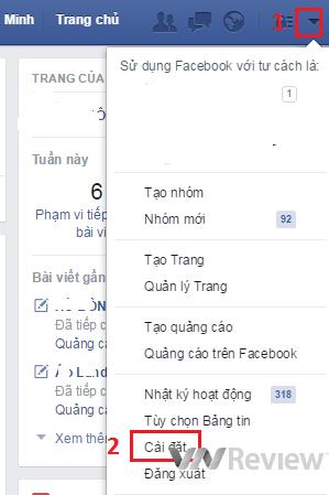 Trên giao diện Facebook, chọn mũi tên chỉ xuống và chọn vào Cài đặt