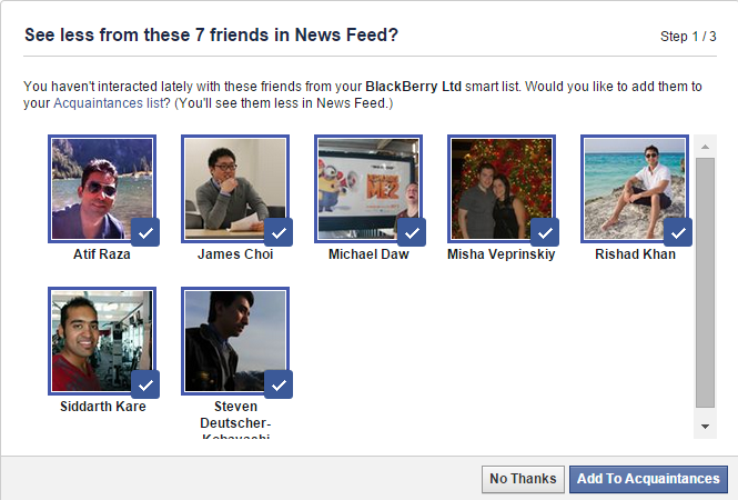 Bạn có thể bỏ chọn một số hoặc tất cả những người mà Facebook gợi ý. Dù bạn chọn “No Thanks” hay “Add to Acquaintances”, bạn cũng sẽ được chuyển sang nhóm bạn bè mới.