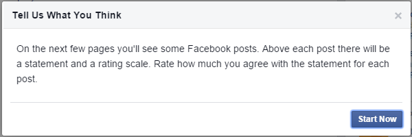 Bạn sẽ thấy một tin nhắn mở ra “Tell Us What You Think” (Nói với chúng tôi suy nghĩ của bạn), cho biết bạn sẽ bắt đầu đánh giá các nội dung trên Facebook (chính xác là có 15 câu hỏi). Hãy click vào nút “Start now”.