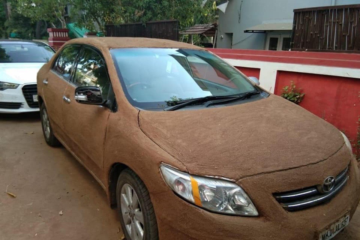 Hình ảnh về chiếc xe đang được chia sẻ trên các phương tiện truyền thông xã hội cho thấy chiếc xe Toyota "ngập" trong phân bò để giữ mát trong thời tiết nóng, báo chí Ấn Độ đưa tin.