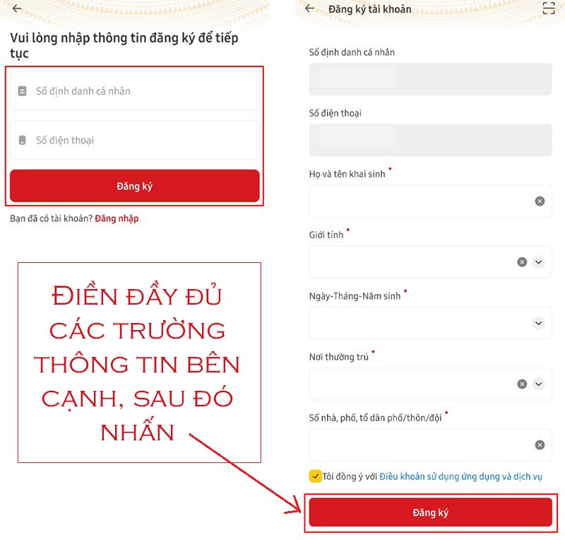 Tại màn hình đăng ký, người dùng điền số định danh cá nhân (mã số được in trên thẻ CCCD 12 số) và số điện thoại của mình để đăng ký.