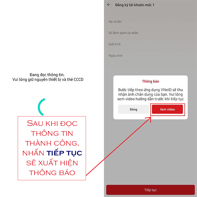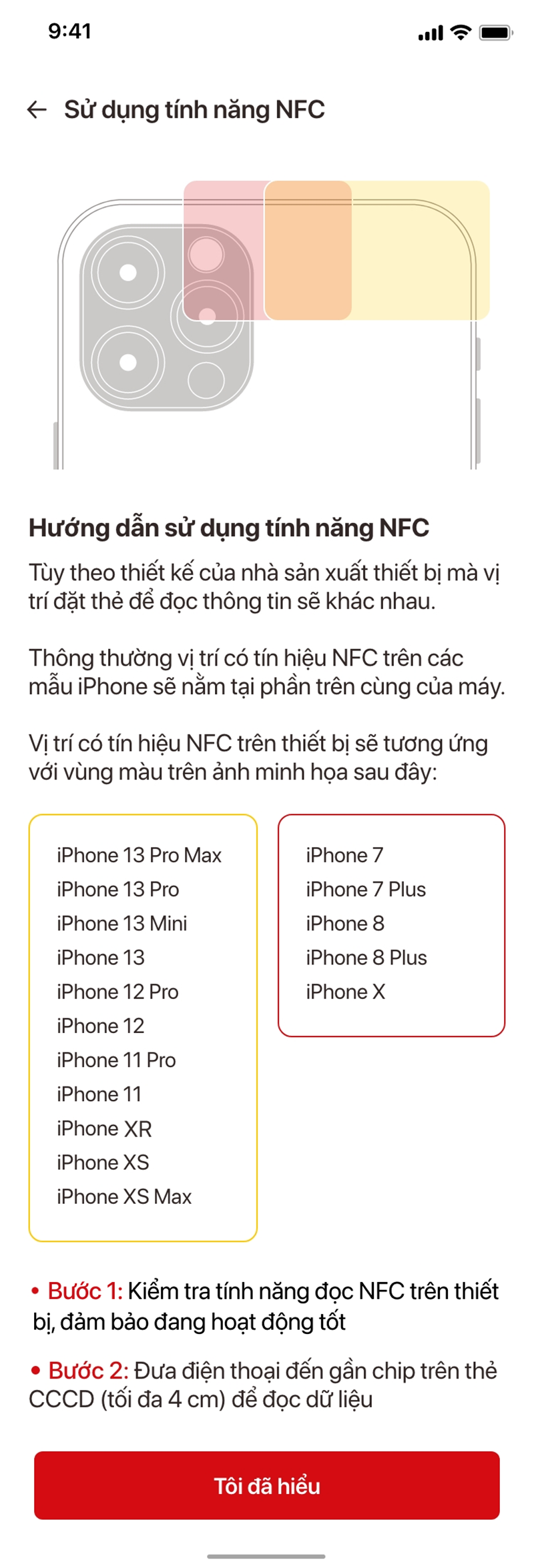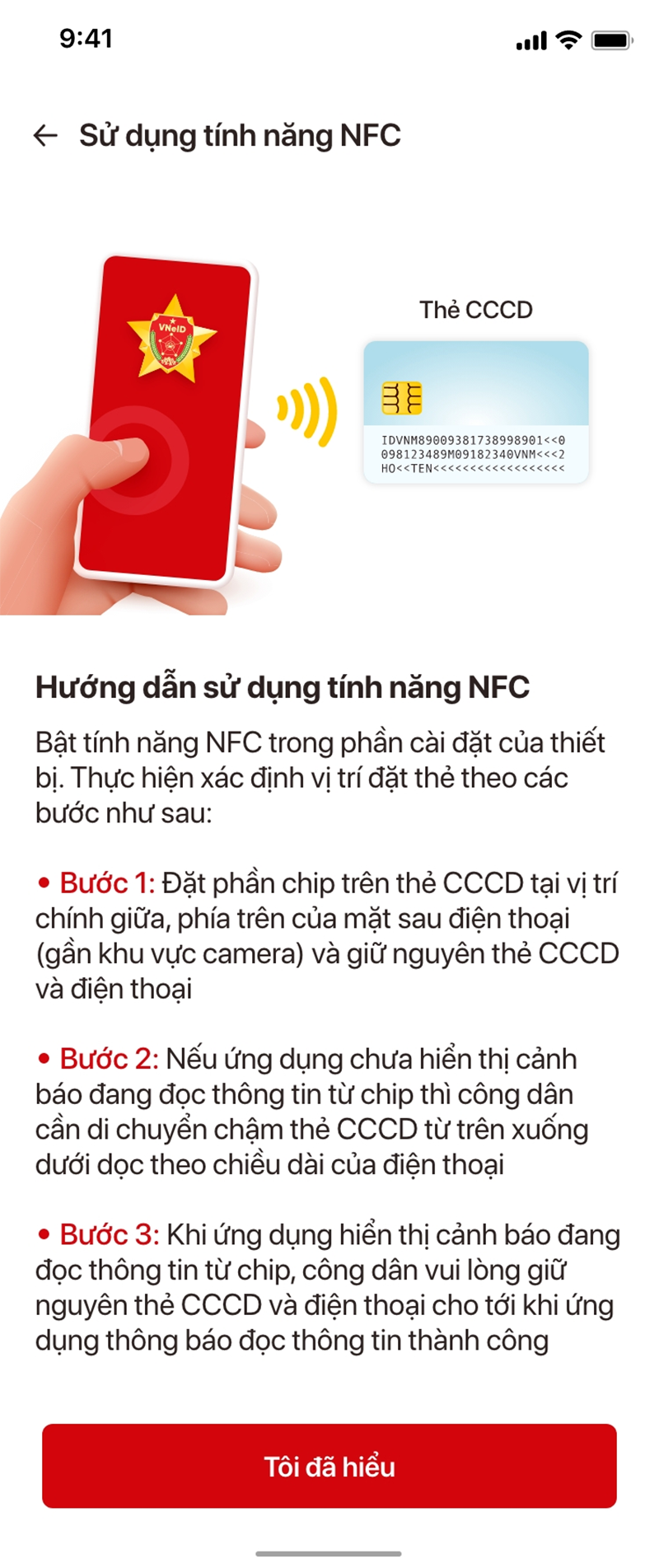 Tại màn hình hướng dẫn đăng ký tài khoản Mức 1, chọn Bắt đầu. Nếu thiết bị di động của bạn có hỗ trợ NFC thì sẽ xuất hiện màn hình dưới đây (tương ứng với thiết bị sử dụng hệ điều hành iOS và Android). Để bắt đầu đọc thông tin thẻ bằng NFC, bạn hãy nhấn vào Tôi đã hiểu.