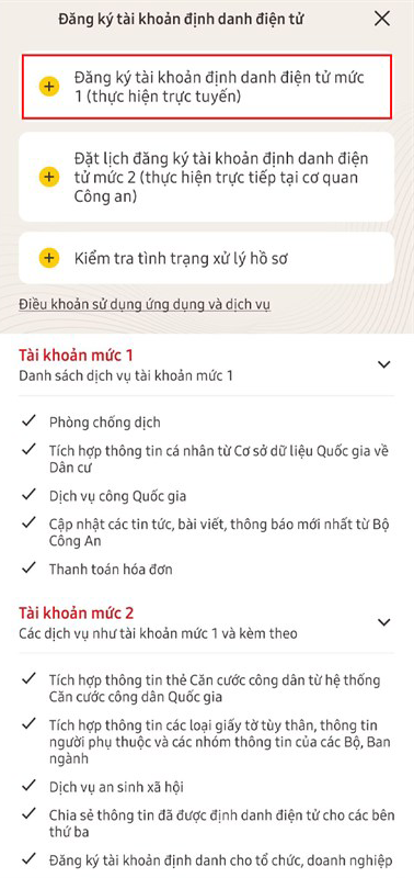 Sau khi Đăng nhập, lựa chọn “Đăng ký tài khoản mức 1”.